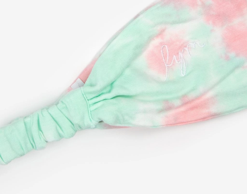 This aqua and pink tie dye knit headband is perfect for a casual day or your hardest workout! This athletic style headband features a flat front with the Love Your Melon cursive logo embroidery in white and an encased elasticated back to fit most heads.