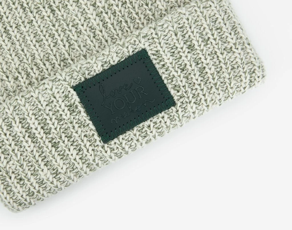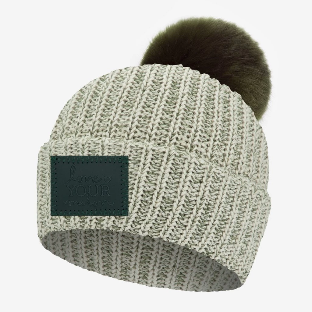 This army green speckled cuffed pom beanie features an army green leather patch debossed with the Love Your Melon logo on the front and a detachable army green faux fur pom. These beanies are very cozy and warm and fit more snug.