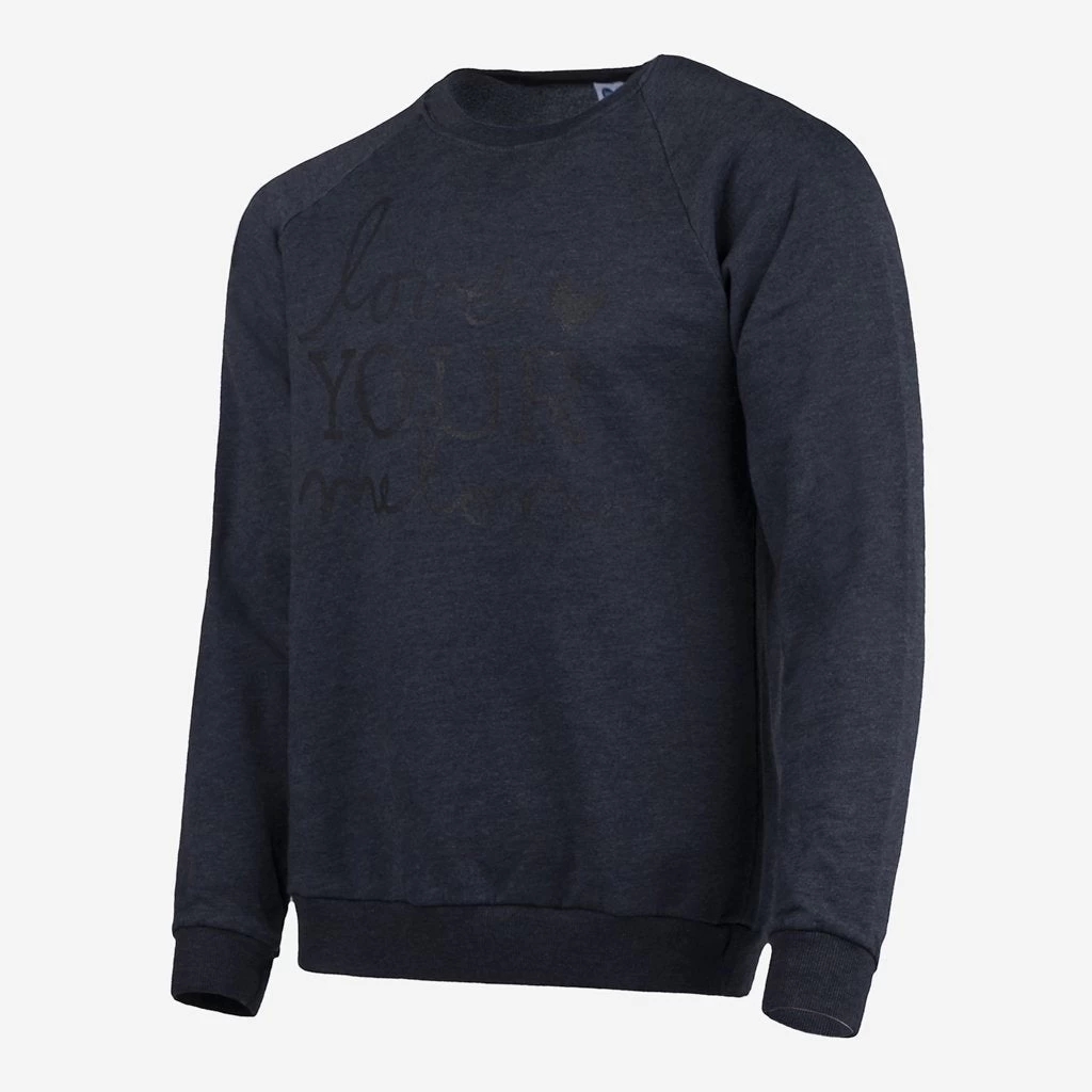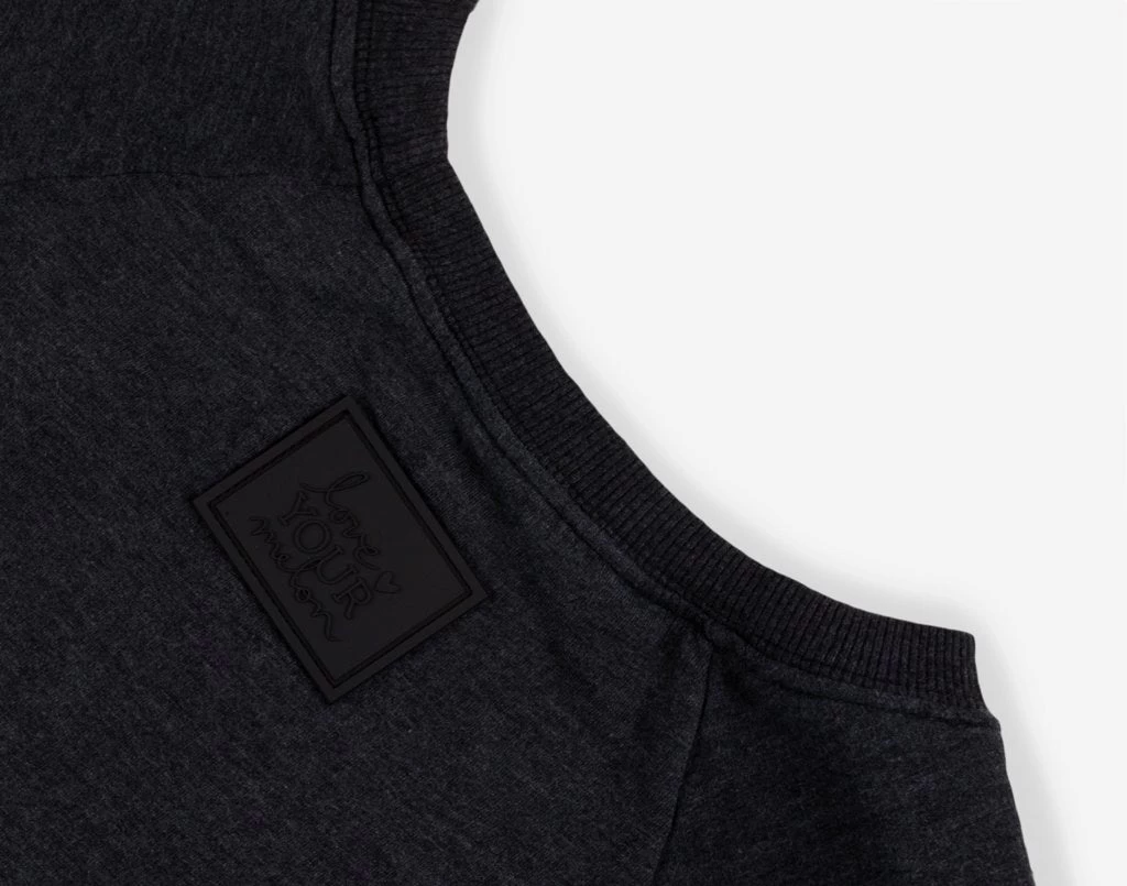 This black fleece crew sweatshirt has the classic Love Your Melon stacked logo screened on the front in a tonal print and a color-matched rubber patch at the back neck.