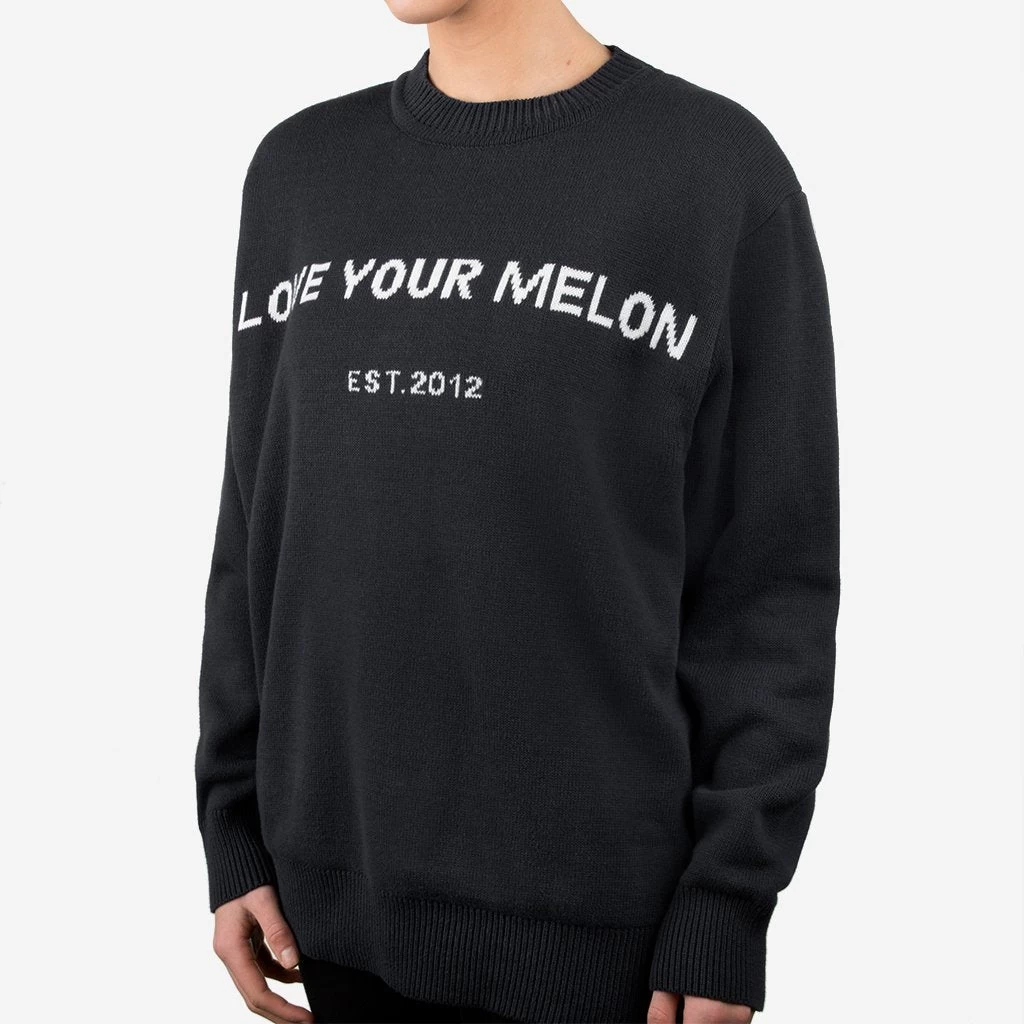 This classic logo sweater is made out of 100% Cotton Yarn in black yarn and features the Love Your Melon Est. 2012 Logo knit in white on the front. These sweaters feature a crewneck style, ribbed cuffs, and a loose oversized fit. Womens fit. See chart below for sizing.