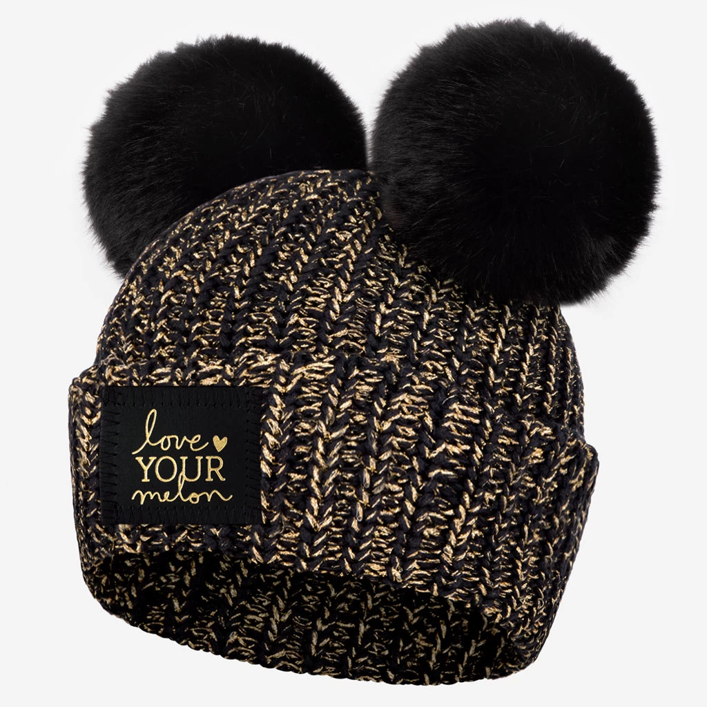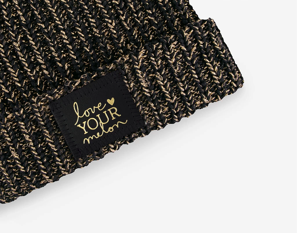 This black gold metallic yarn cuffed pom beanie features a black leather patch debossed with the Love Your Melon logo on the front in gold foil and two detachable black faux fur poms. These beanies are very cozy and warm and fit more snug.