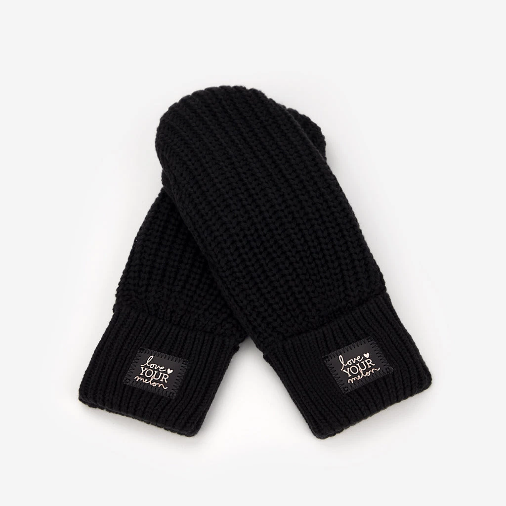 These mittens are knit with black yarn and are very comfortable and warm. They feature a mini monochrome leather patch debossed with the Love Your Melon logo in rose foil with on the outer cuff.