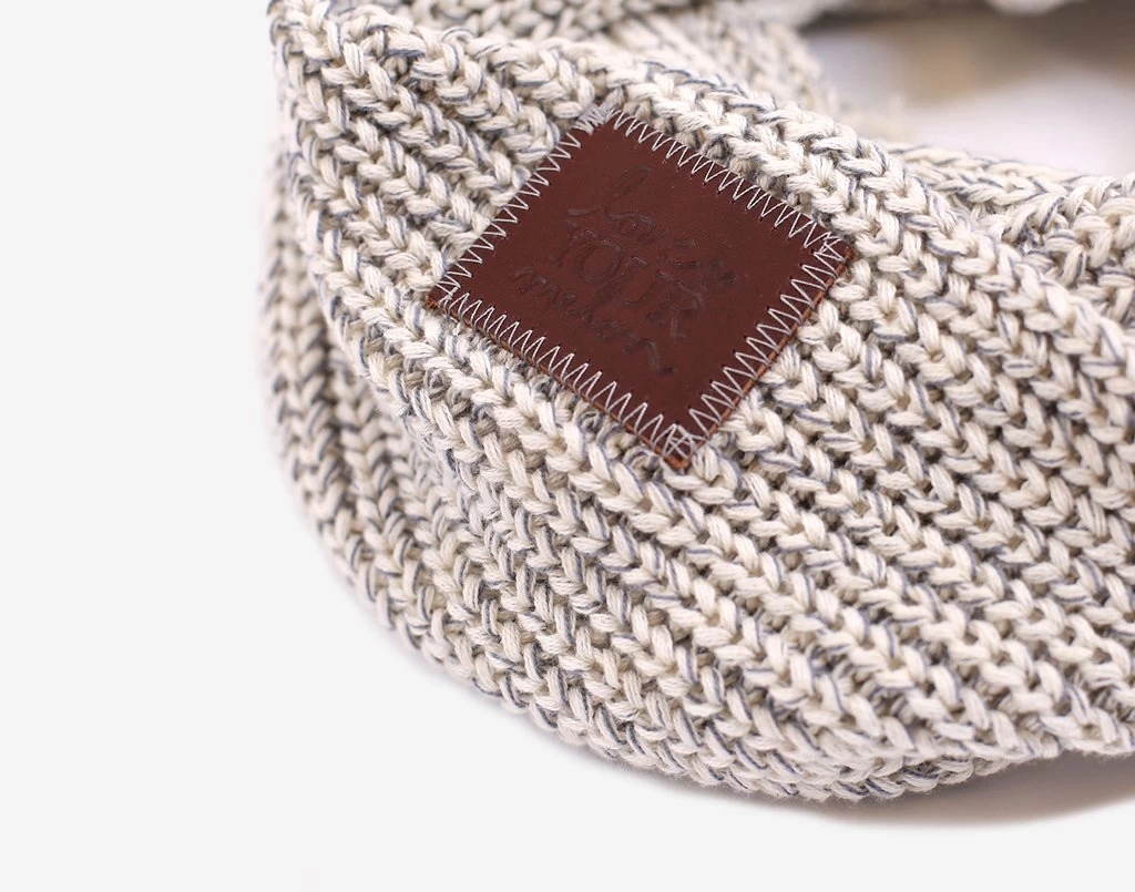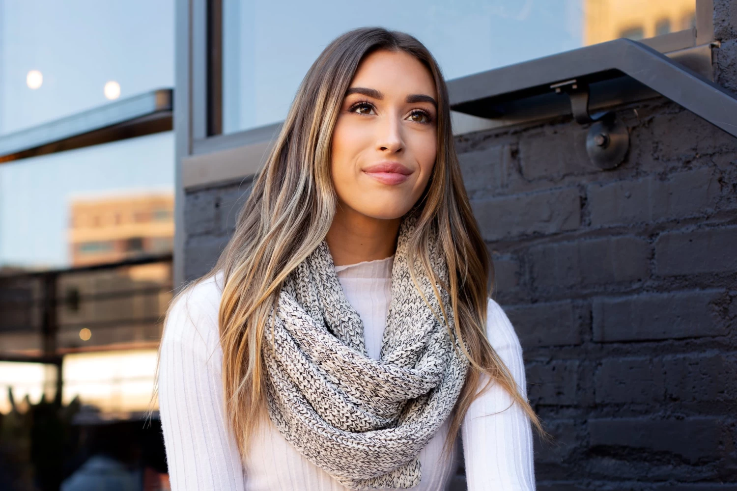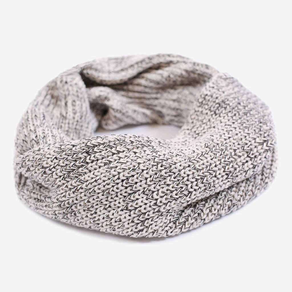 This black speckled circle infinity scarf features a red maple leather patch debossed with the Love Your Melon logo.