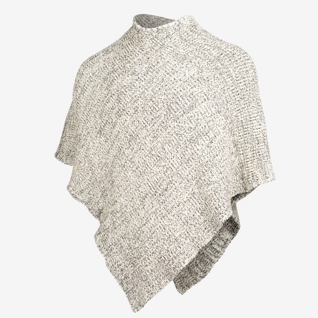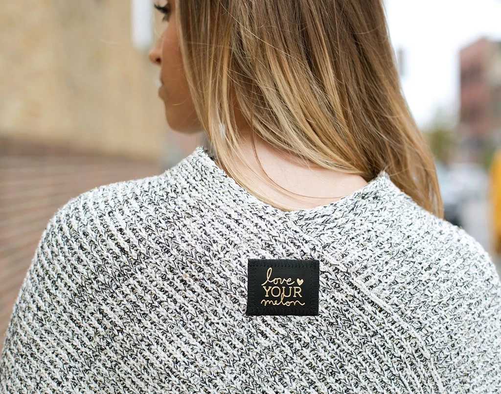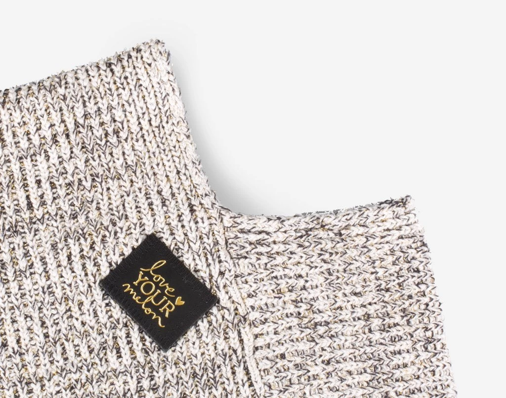 This shawl is knit in natural and black cotton yarn and metallic gold yarn and features a black leather patch debossed with the Love Your Melon stacked logo on the back in gold. One size. Machine washable.