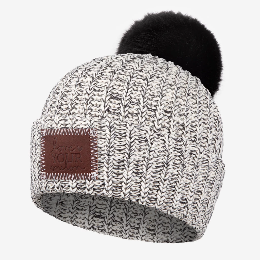 ThisĀ black speckled cuffed pom beanie features aĀ red maple leather patch debossed with the Love Your Melon logo on the front and a detachable black faux fur pom. These beanies are very cozy and warm and fit more snug.