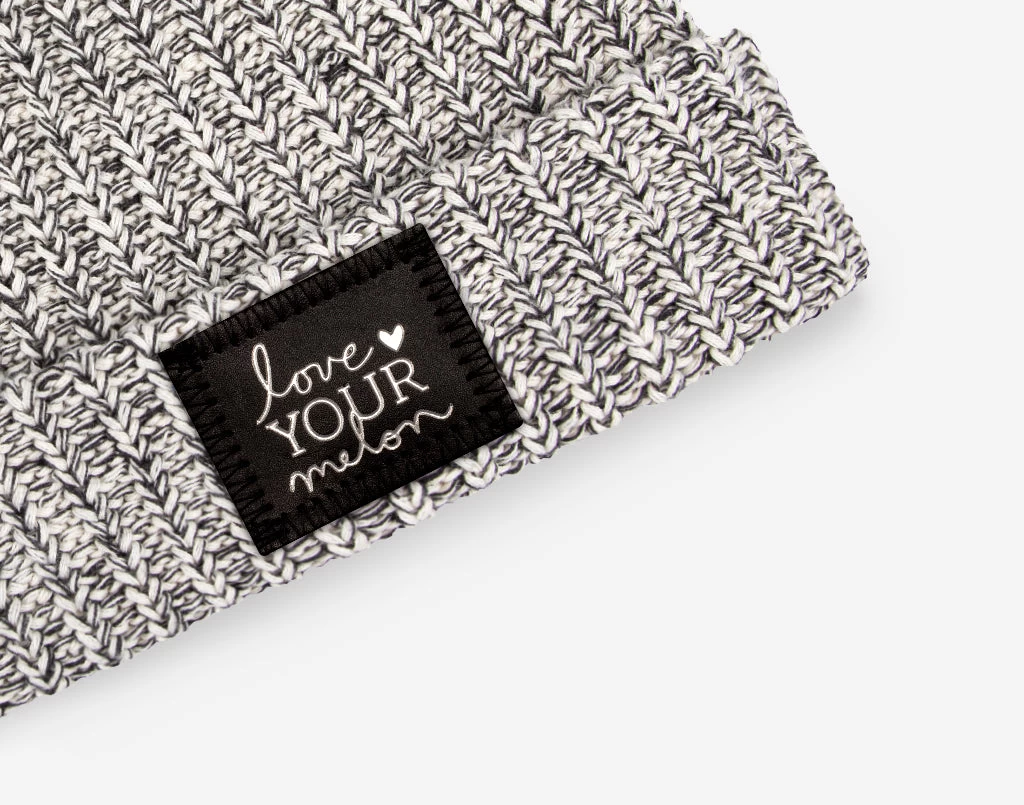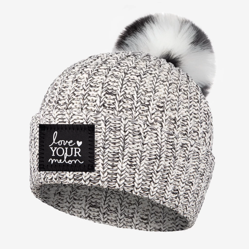 This black speckled cuffed pom beanie features a black leather patch debossed with the Love Your Melon logo on the front in white metallic foil and a detachable black, light charcoal and white tri-color faux fur pom. These beanies are very cozy and warm and fit more snug.