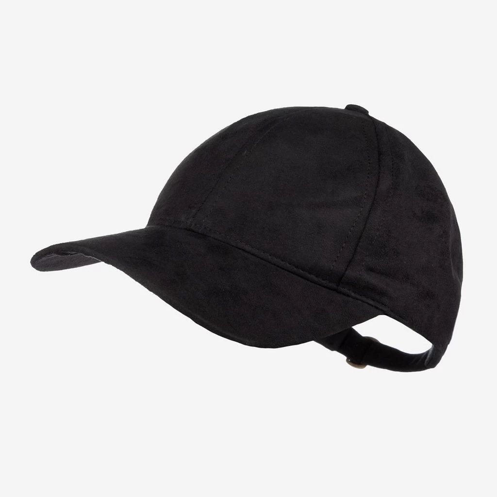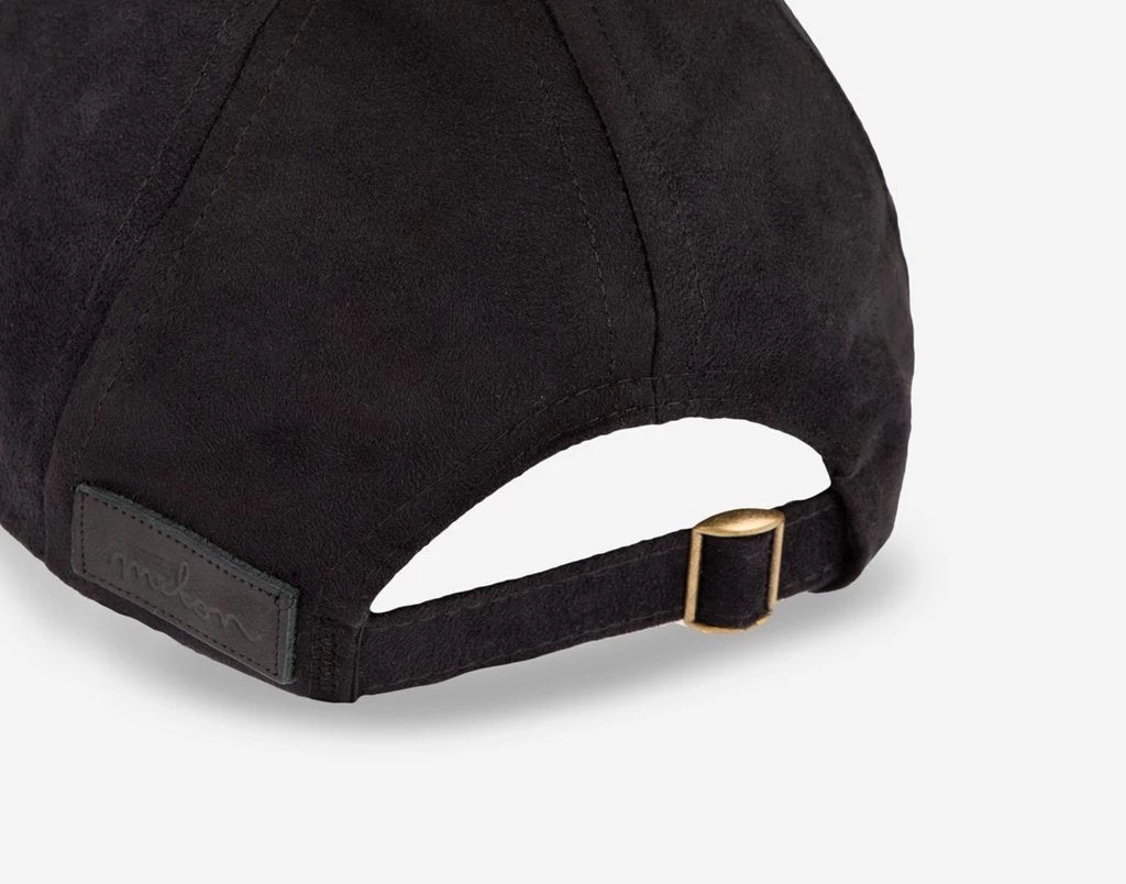 This black suede baseball cap is made out of 100% faux suede and features a black rectangular leather melon patch on the back left of the cap. One size fits all with an adjustable strap. Made in the USA.