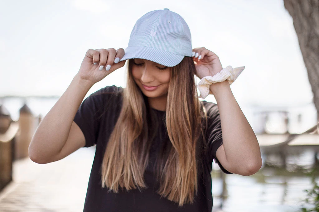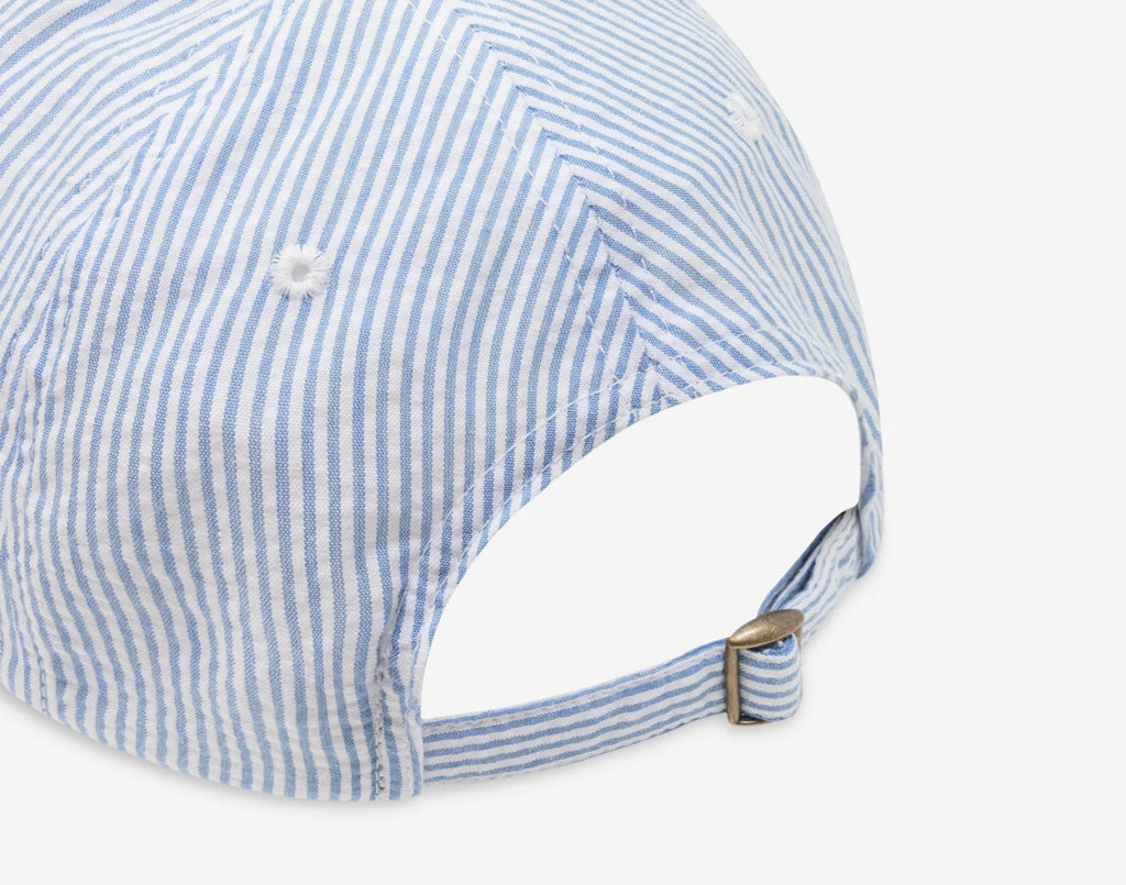This blue seersucker cap features the Love Your Melon knit heart logo embroidered on the front in white and an adjustable strap at the back. This cap is unstructured.