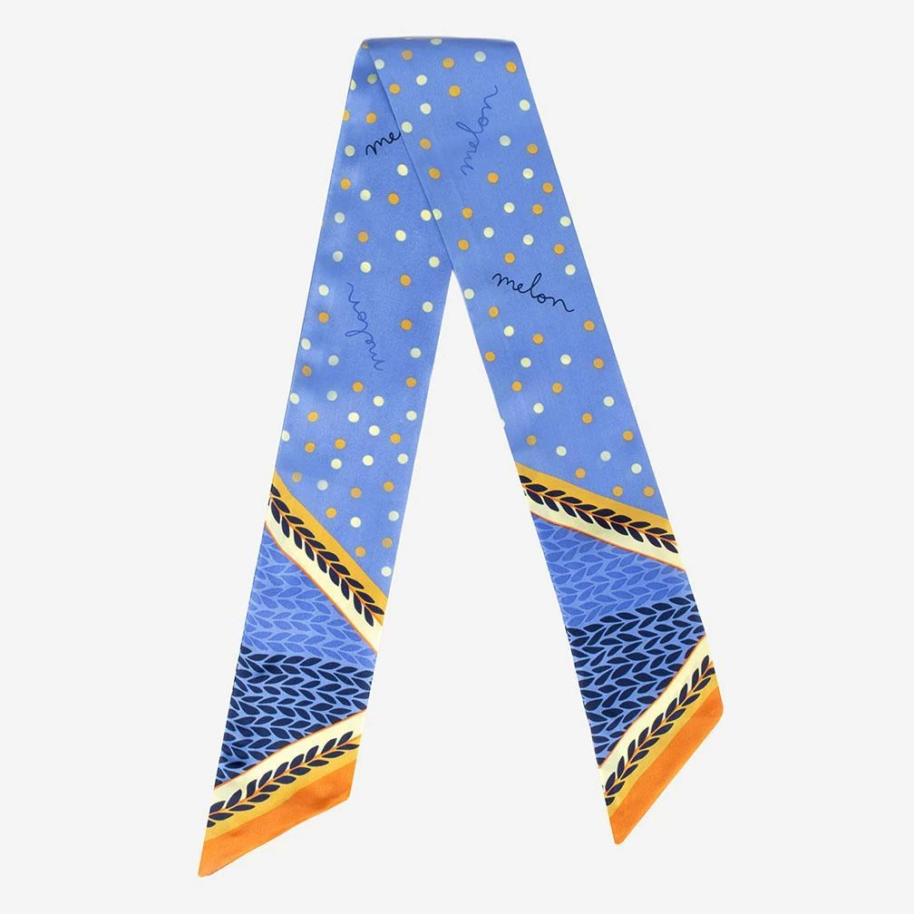 This blue scarf is 100% silk and hand-screened. It features a uniquely designed multicolor polka dot and knit print in hues of blue, marigold, and orange.