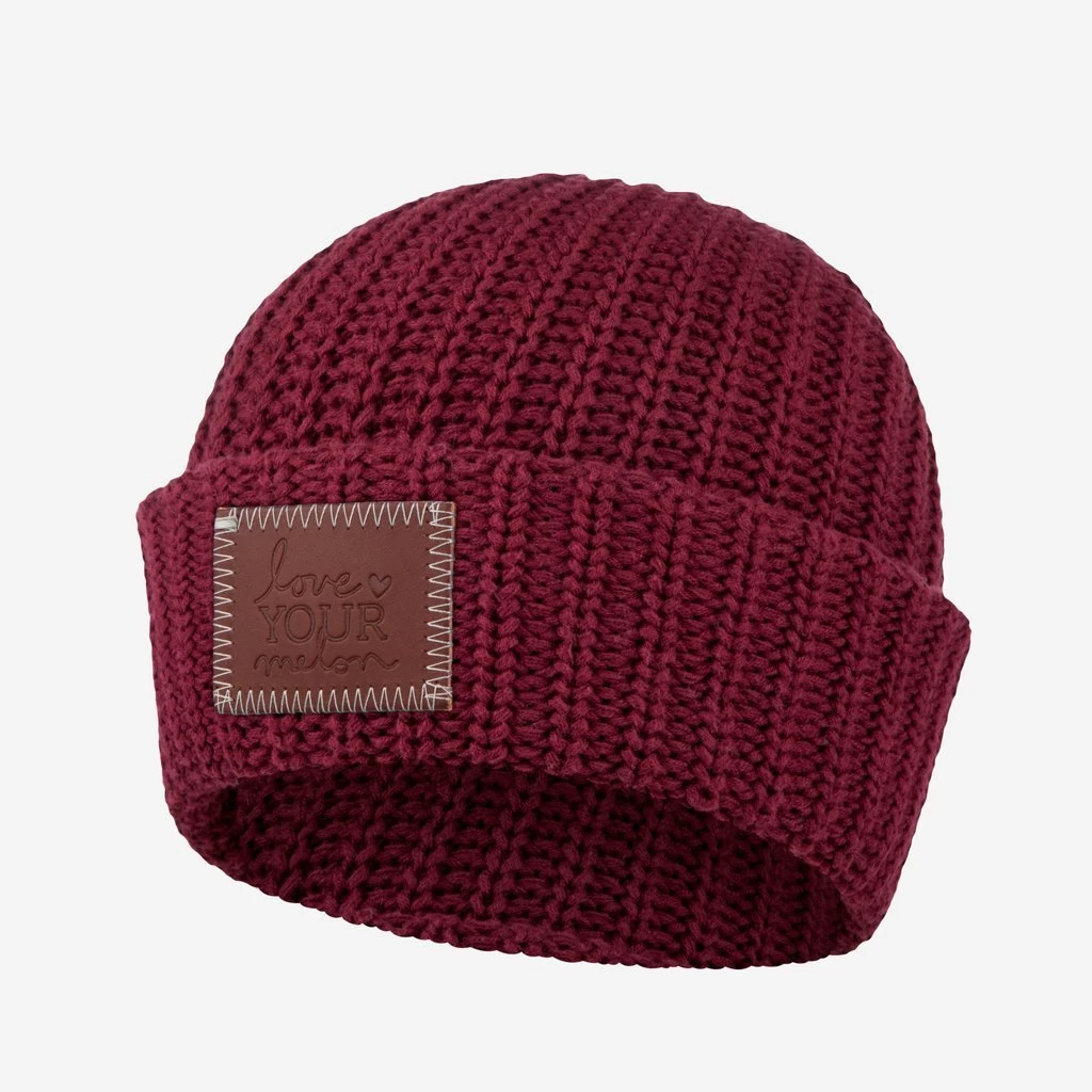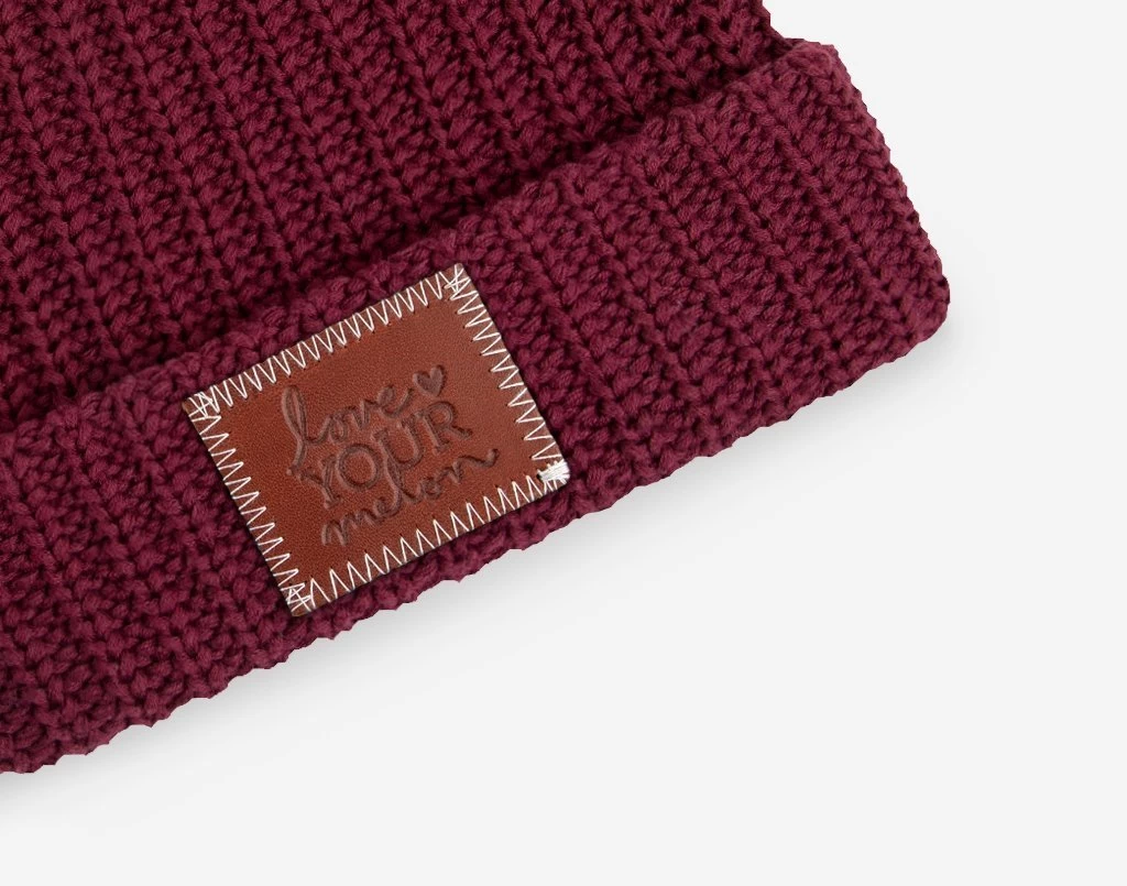 This cuffed burgundy beanie features a red maple leather patch debossed with the Love Your Melon logo on the front. These burgundy beanies are very cozy and warm and fit more snug.