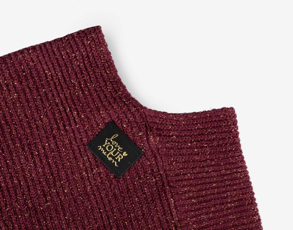 This women’s shawl is knit in burgundy cotton yarn and metallic gold yarn and features a black leather patch debossed with the Love Your Melon stacked logo on the back in gold. One size. Machine washable.