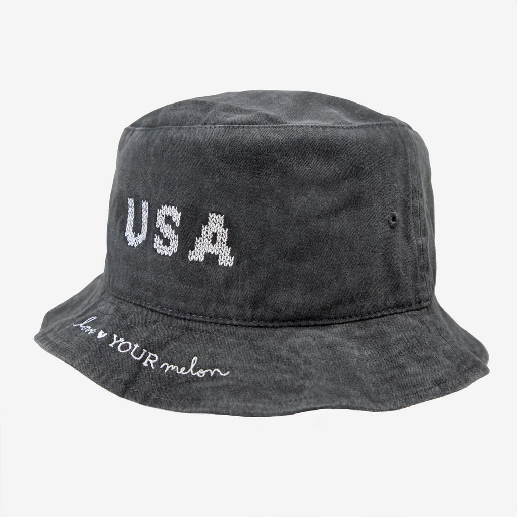 This enzyme washed charcoal bucket hat has “USA” in knit print embroidered on the center front of the hat and the Love Your Melon cursive logo along the front brim.