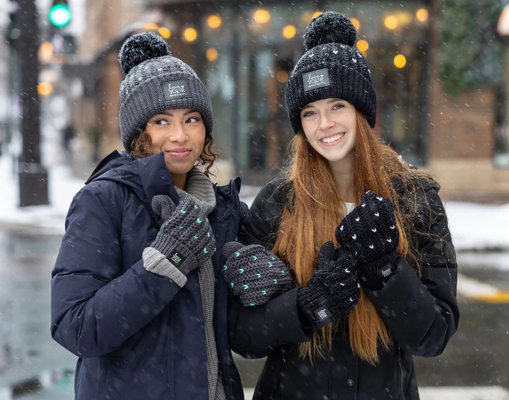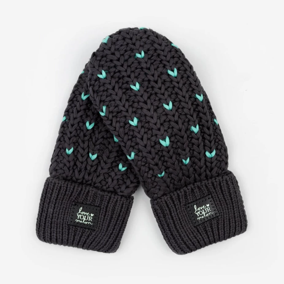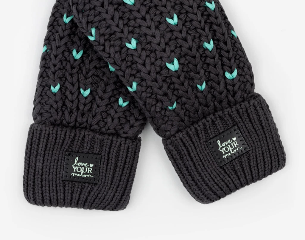 Cozier than ever! The Dark Charcoal and Mint Fair Isle Hearts Mittens feature a cute contrasting heart pattern on our double-thick chunky knit while soft fleece lining brings extra warmth. These mittens are tacked on both cuffs and feature a mini black leather patch with the Love Your Melon logo debossed in a metallic mint foil on both hands.