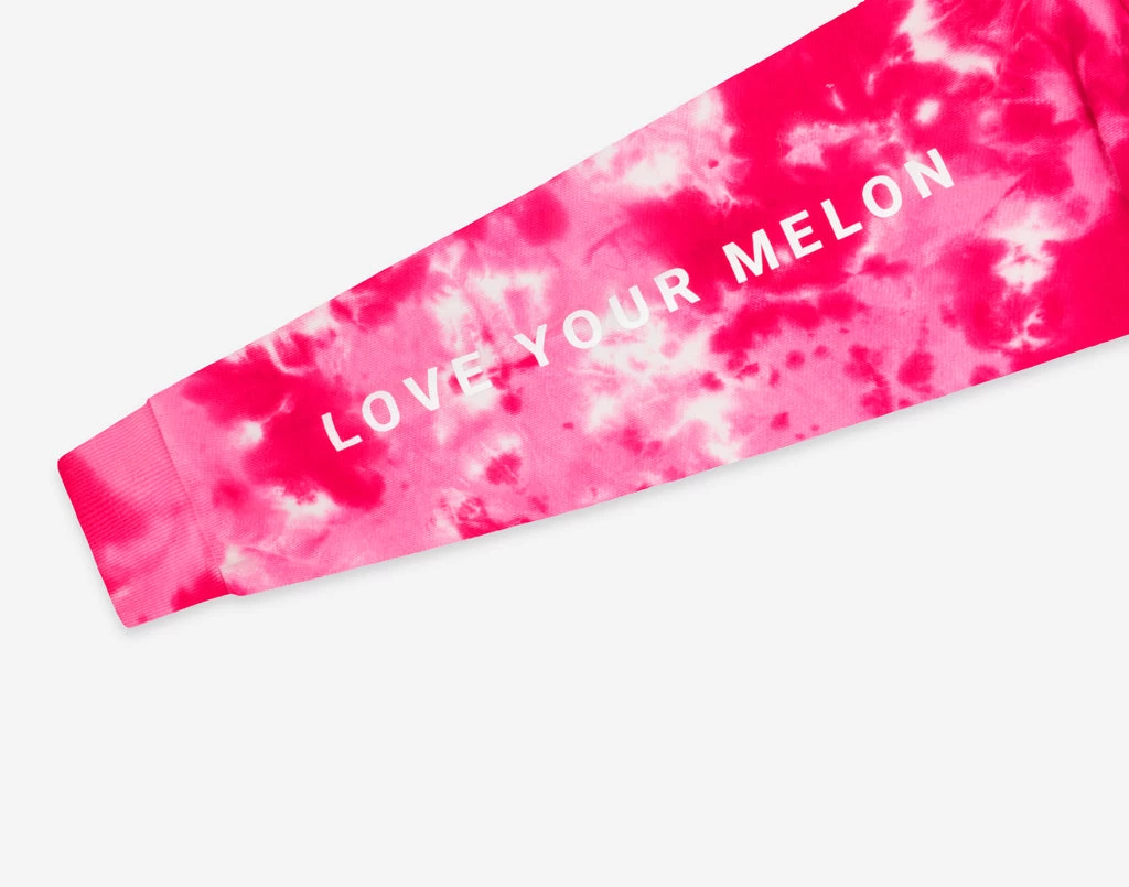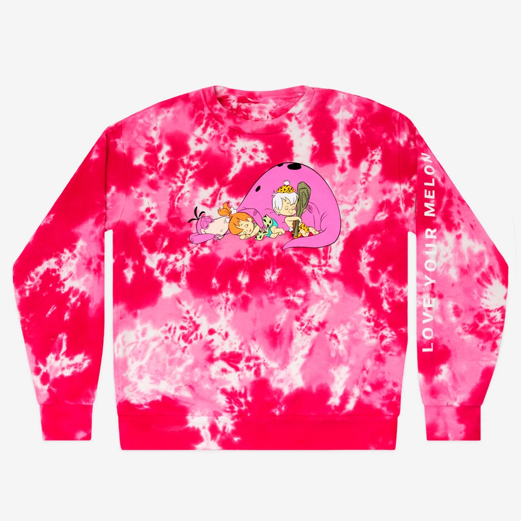 You will rock this crew neck in Stone Age style! This crew neck sweatshirt is made from heavyweight reactive-dyed French Terry cotton and silicone washed for a super soft, relaxed fit and then individually tie dyed for a hoodie that is uniquely yours. This crew neck features the Dino, Pebbles, Bamm-Bamm icons on the front and the Love Your Melon logo up the side of the sleeve.