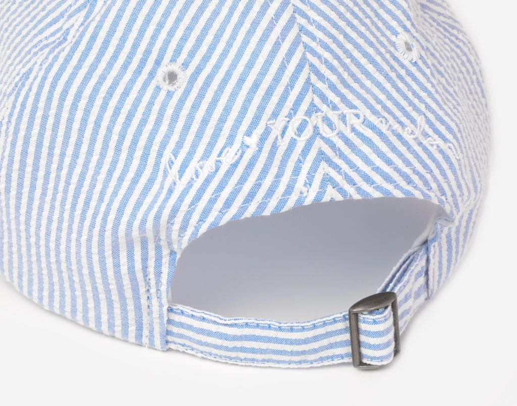 This Donald Duck blue seersucker cap will have you smiling from ear to ear! This cap is made from a stylish seersucker striped fabric that is lightweight, breathable, and soft with the Donald Duck face embroidered on the center front, and the Love Your Melon logo embroidered over the back arch. This cap is unstructured and features an adjustable strap and buckle at the back.