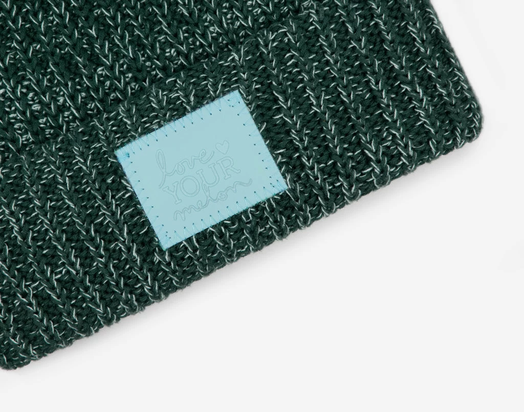 This evergreen speckled cuffed pom beanie features a light blue leather patch debossed with the Love Your Melon logo on the front and a detachable light blue faux fur pom. These beanies are very cozy and warm and fit more snug.