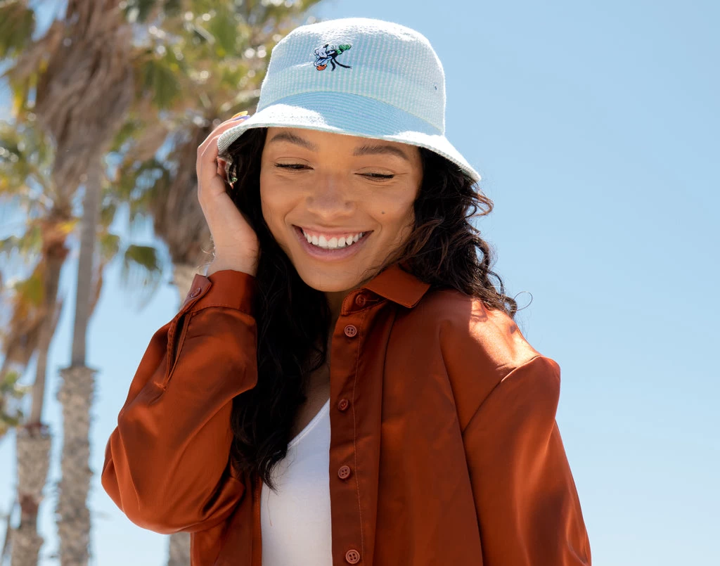 This Goofy green seersucker bucket hat will have you smiling from ear to ear! This cap is made from a stylish seersucker striped fabric that is lightweight, breathable, and soft with the Goofy face embroidered on the center front, and the Love Your Melon logo embroidered over the front brim. This bucket hat features a double stitched brim with embroidered eyelets for air flow.