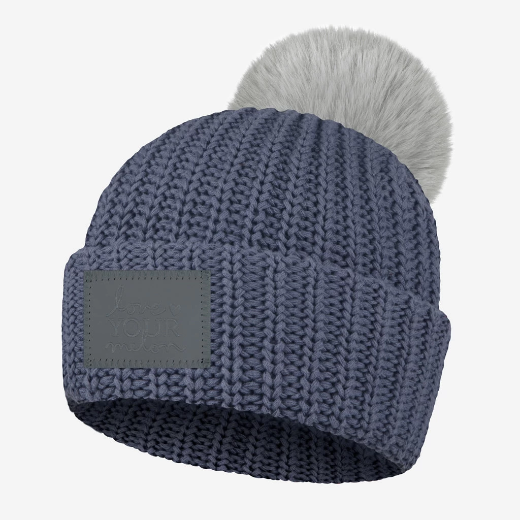 This graphite cuffed pom beanie features a graphite leather patch debossed with the Love Your Melon logo on the front and a detachable silver faux fur pom. These beanies are very cozy and warm and fit more snug.