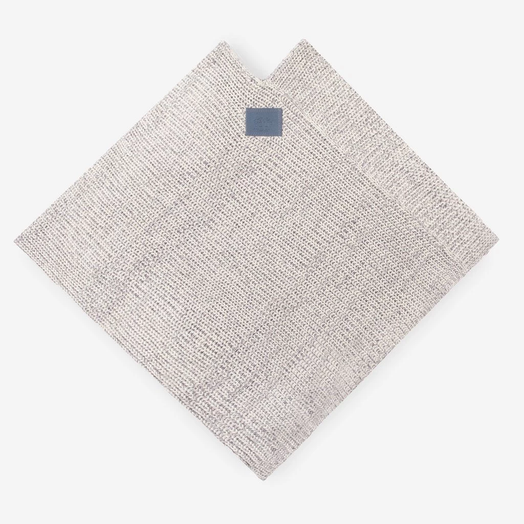 This shawl is knit in 100% cotton yarn in natural and light charcoal colors and features a gray leather patch debossed with the Love Your Melon logo on the back. One size. Machine washable.