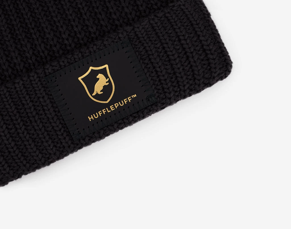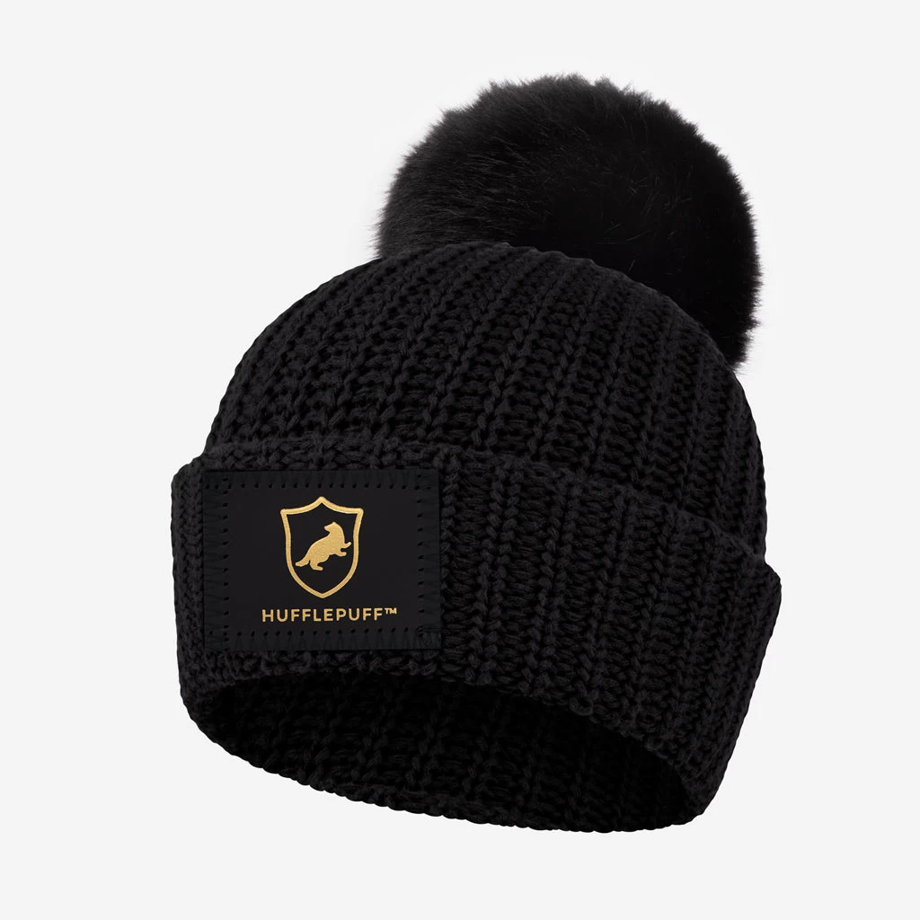 Show off your pride in style with this Hufflepuff™ kids pom beanie! This cozy navy kids pom beanie features a black leather patch with the Hufflepuff™ crest and name in gold foil, as well as a detachable black faux fur pom. These beanies are incredibly cozy and fit more snug.