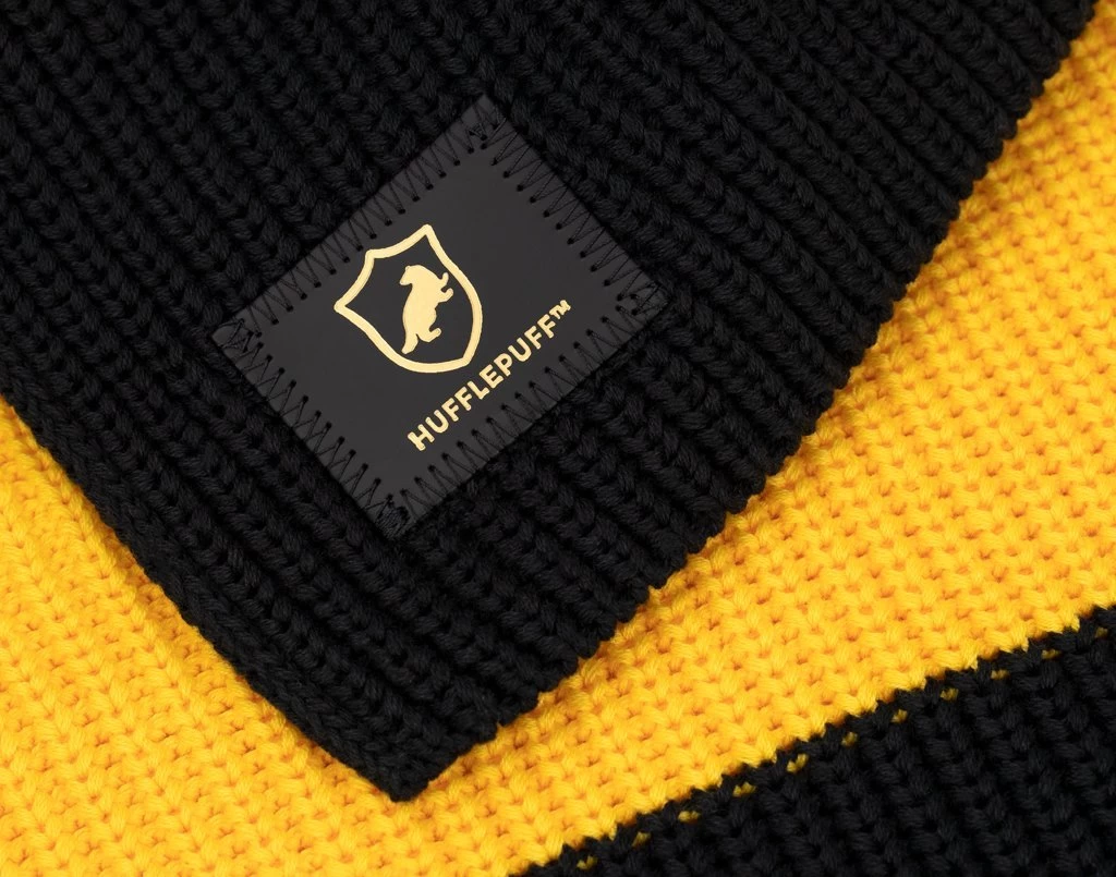 Show off your pride in style! This cozy 100% cotton scarf features the Hufflepuff™ colors, as well as a black leather patch with the Hufflepuff™ crest and name in gold foil.