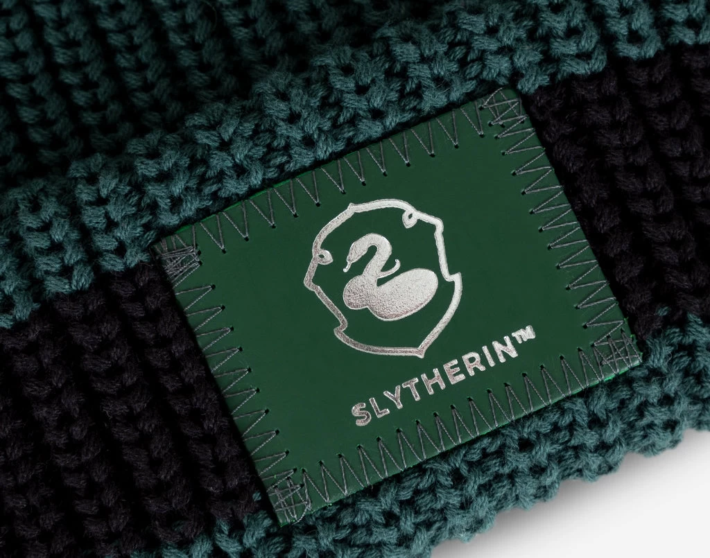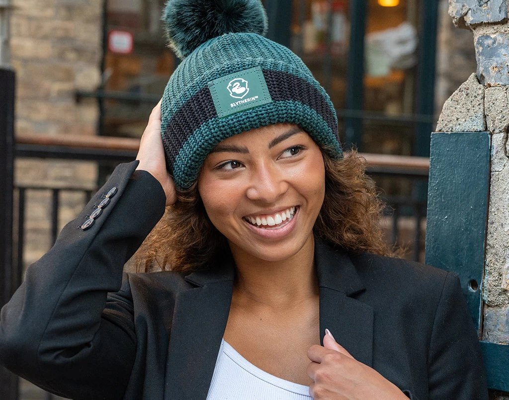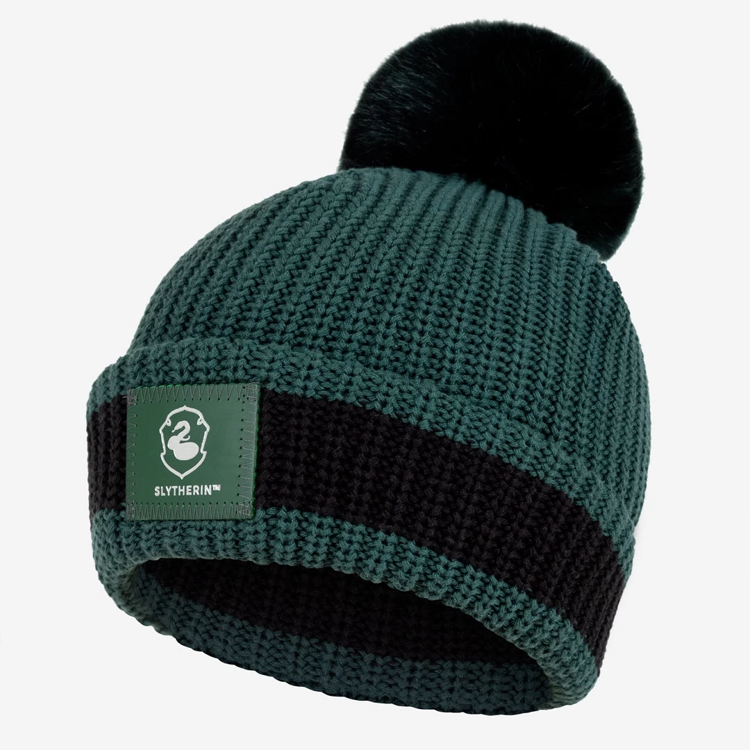 Slytherinâ„¢ pride! This hunter green and black Pom Beanie features the Slytherinâ„¢ crest debossed in a metallic silver foil on a hunter green leather patch, and is topped with a detachable hunter green faux fur pom. Made from our coziest double-thick knit, this beanie is perfect for the Back to Hogwartsâ„¢ season!