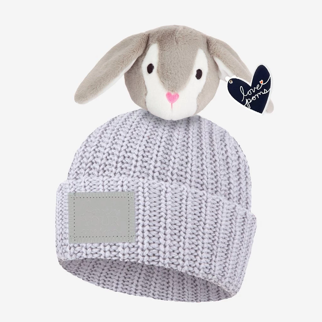 This high rise gray cuffed beanie features a gray leather patch debossed with the Love Your Melon logo on the front cuff, and a detachable Love Pom plush novelty Bunny pom. These beanies are beary cozy and warm and fit more snug.