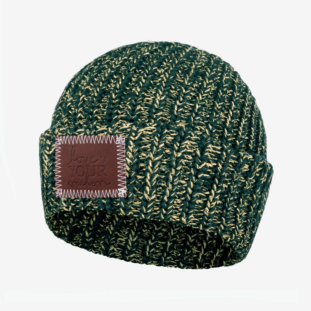 This hunter gold metallic cuffed beanie features a red maple leather patch debossed with the Love Your Melon logo debossed on the front. These beanies are very cozy and warm and fit more snug.