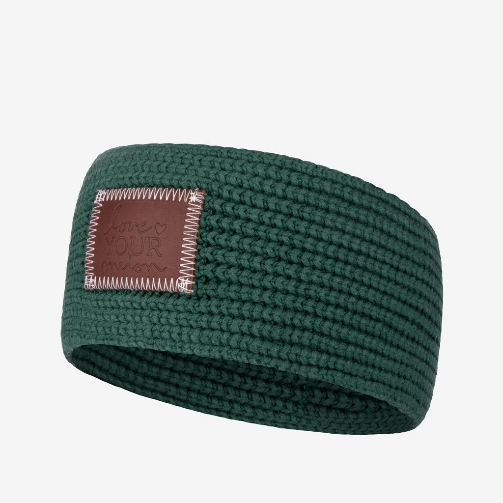 This headband is knit in a hunter green color and features a brown leather patch debossed with the Love Your Melon logo. Machine washable.Â
