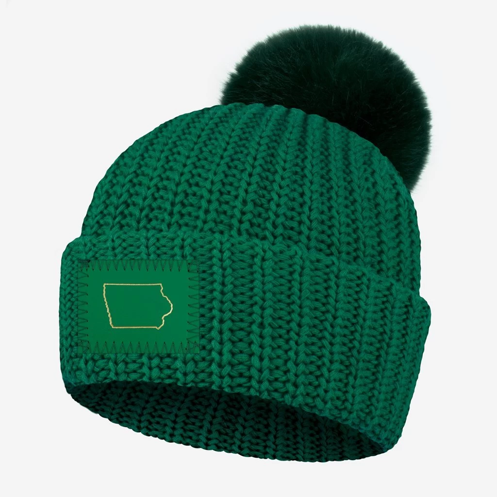 Represent your state with this Iowa state pom beanie! This palm green pom beanie features the great state of Iowa debossed in metallic gold foil on a green leather patch and has a detachable hunter green faux fur pom. These beanies are incredibly cozy and fit more snug.