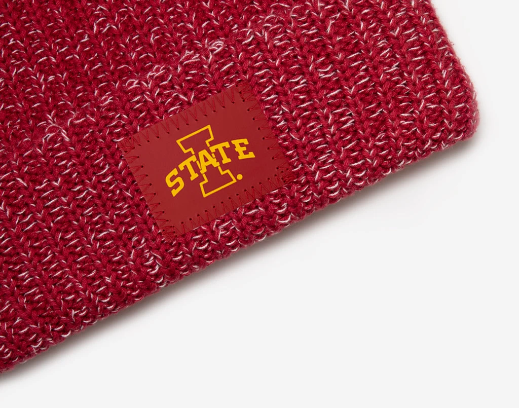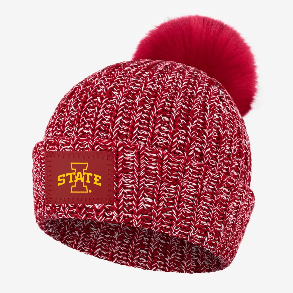 Go Cyclones! This Crimson and White Speckled Beanie features a red leather patch with the Iowa State Cyclones logo debossed in yellow foil. Made from our coziest double-thick knit, and topped with a detachable, interchangeable red faux fur pom.