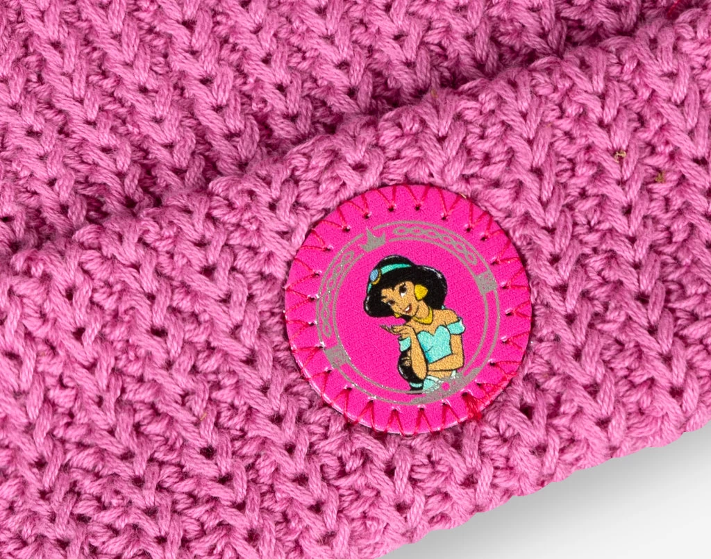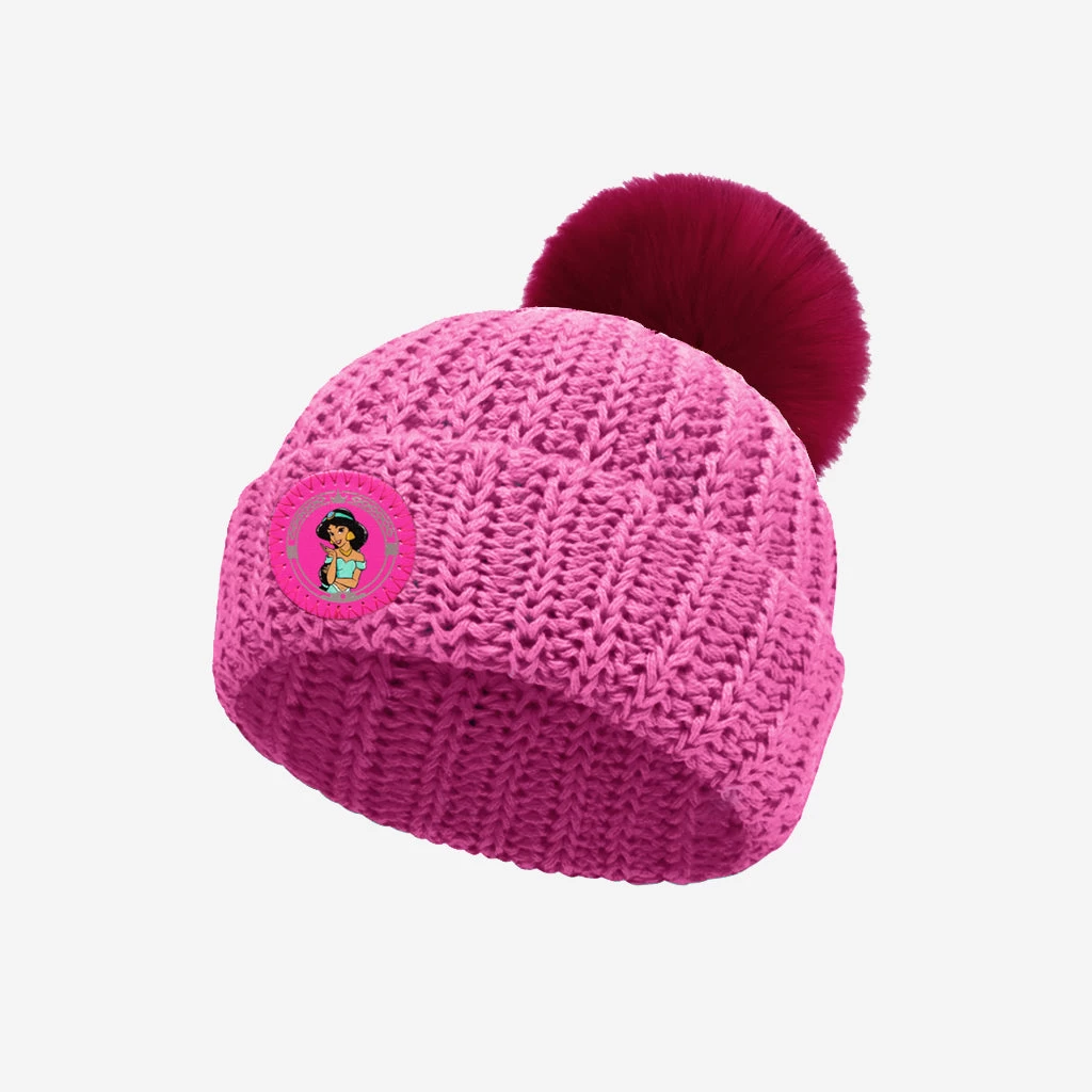 The coziest way to wear your favorite Disney Princess. This Toddler Pom Beanie in a vivid fuschia features Jasmine printed on a circular leather patch, detailed with a mirror frame debossed in a metallic silver foil. This ultra-cozy beanie is the perfect finishing touch to a Halloween costume or everyday outfit.