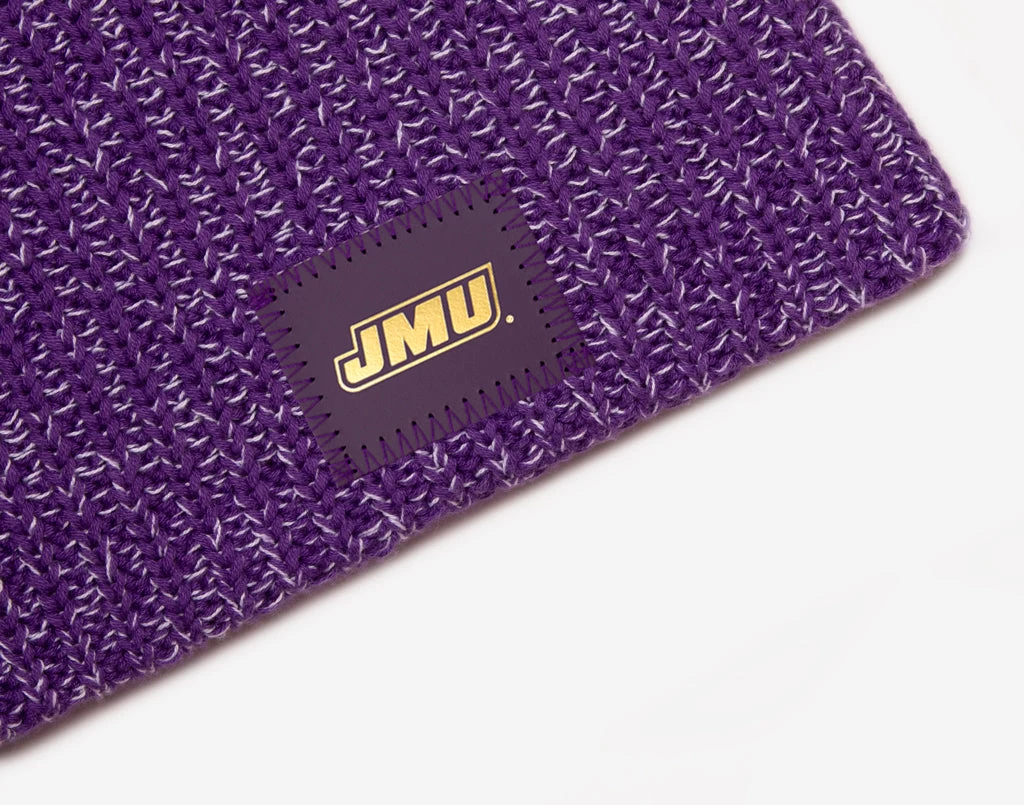 Go Dukes! This Purple and White Speckled Beanie features a purple eather patch with the JMU Dukes logo debossed in metallic gold foil. Made from our coziest double-thick knit, perfect for back-to-campus weather.