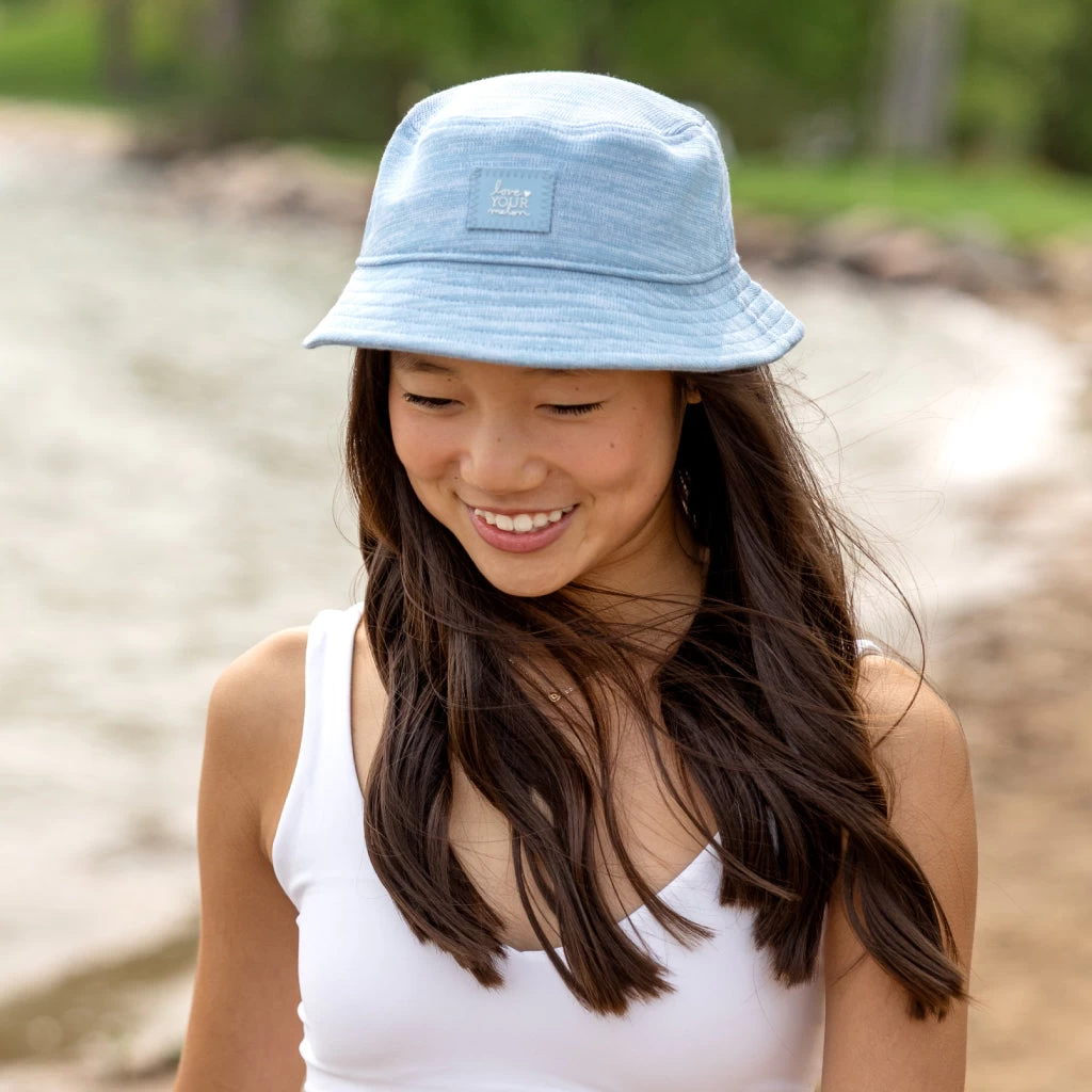 Made with ultra-soft, FitKnitâ„¢ Technology, The Hero Bucket Hat contours to your head for a fit you need to feel to believe. The Kids Blue Speckled Hero bucket hat features a blue silicone patch embossed with the Love Your Melon logo.Â