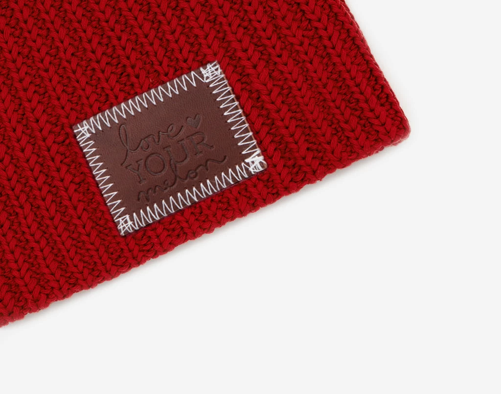This dark red beanie features a red maple leather patch debossed with the Love Your Melon logo on the front. These beanies are very cozy and warm and fit more snug.