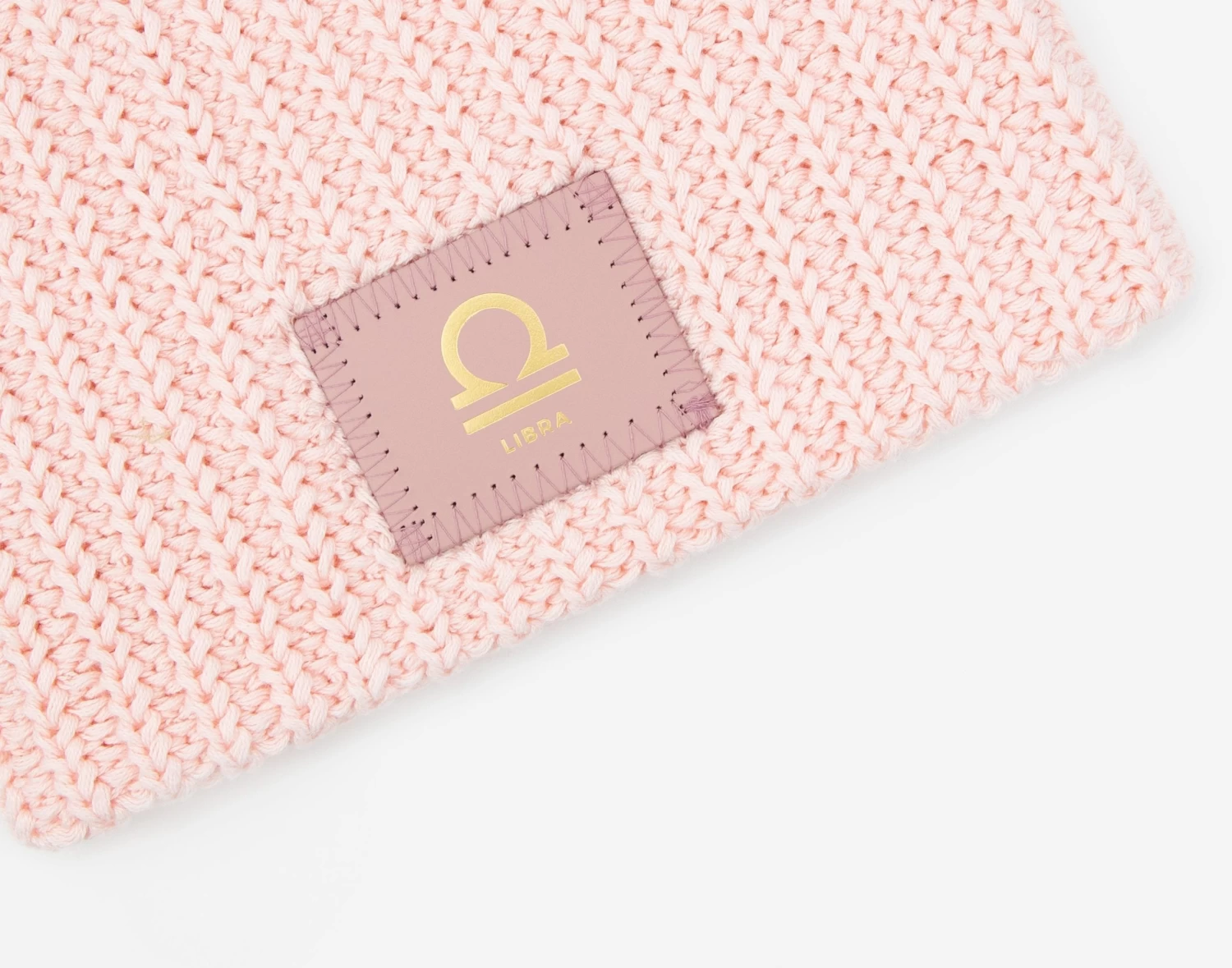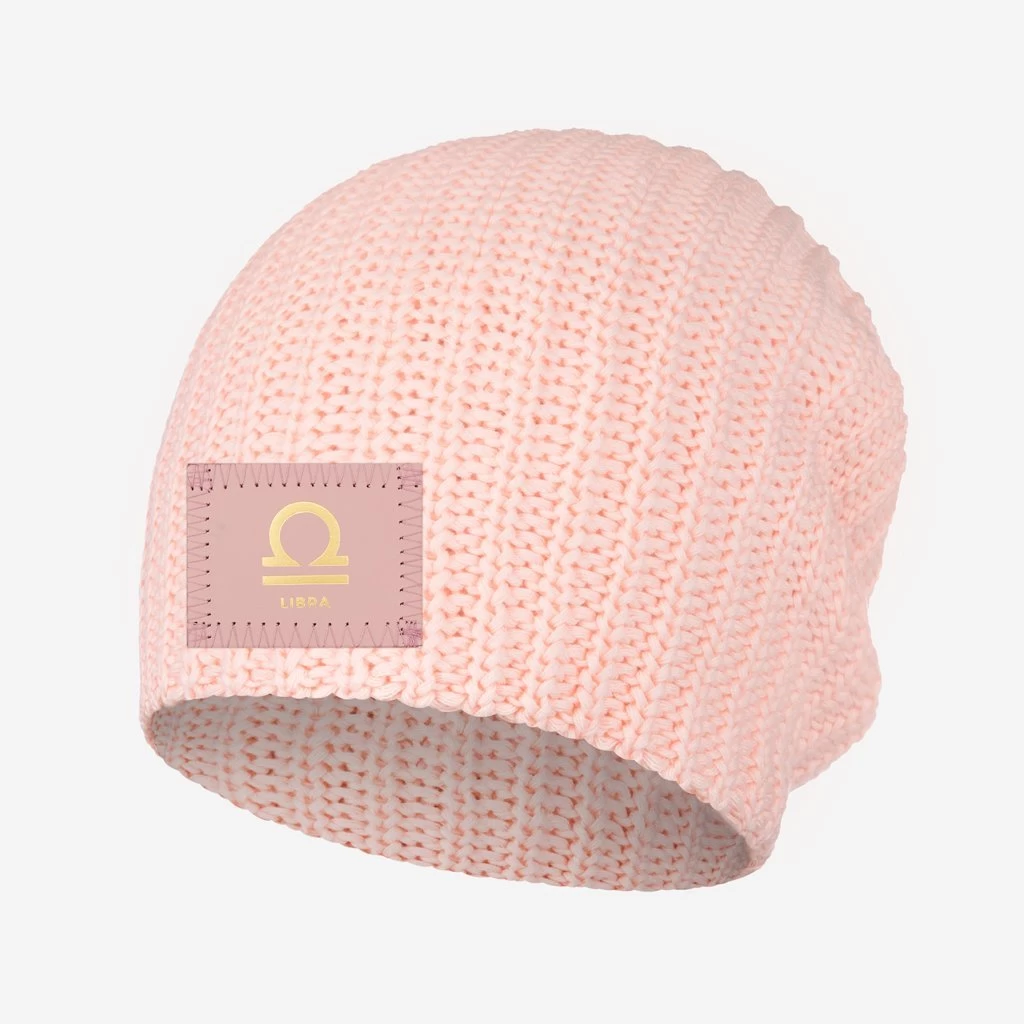Celebrate your sign with this cozy zodiac beanie! This blush beanie features a blush leather patch debossed with the Libra zodiac in gold foil on the front. These beanies are very cozy and warm and have a slouchier fit.