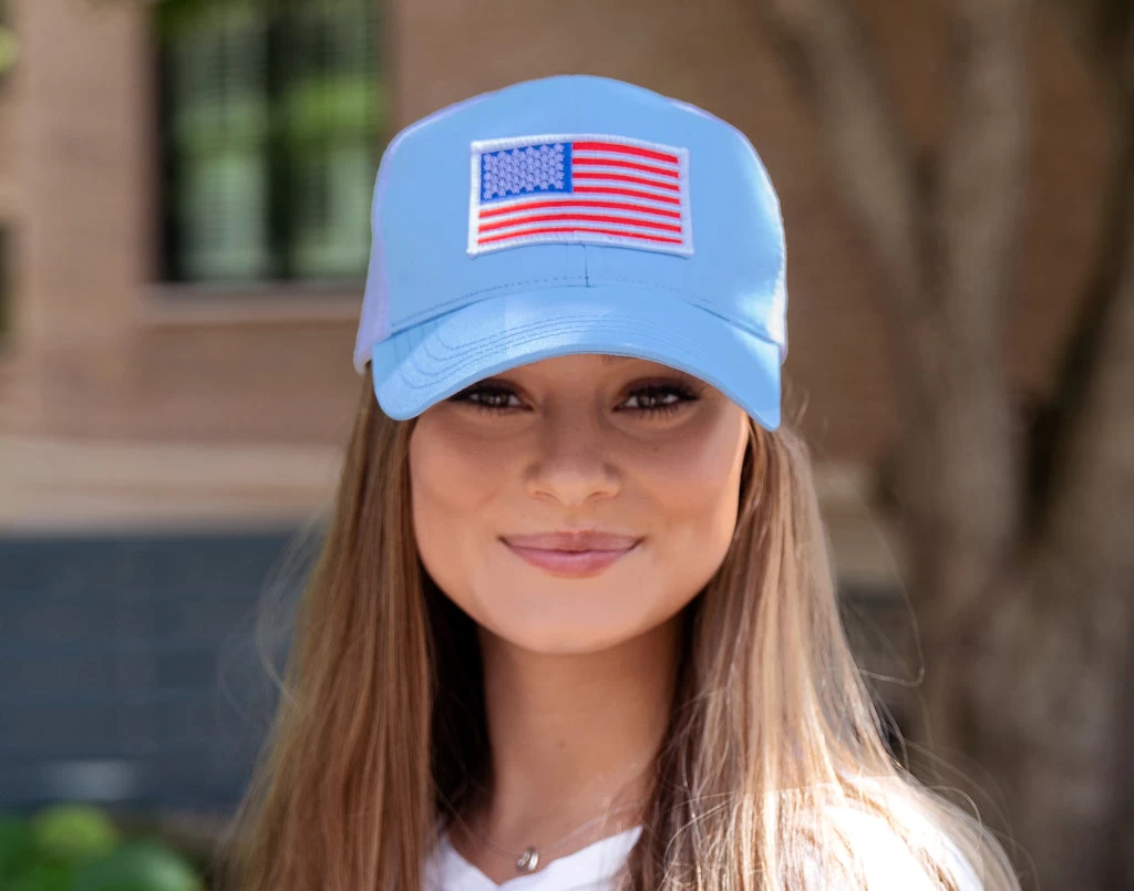 This light blue American flag mesh cap features an American flag patch on the front, horizontal Love Your Melon logo over the back closure, white mesh on the back and an adjustable strap at the back.