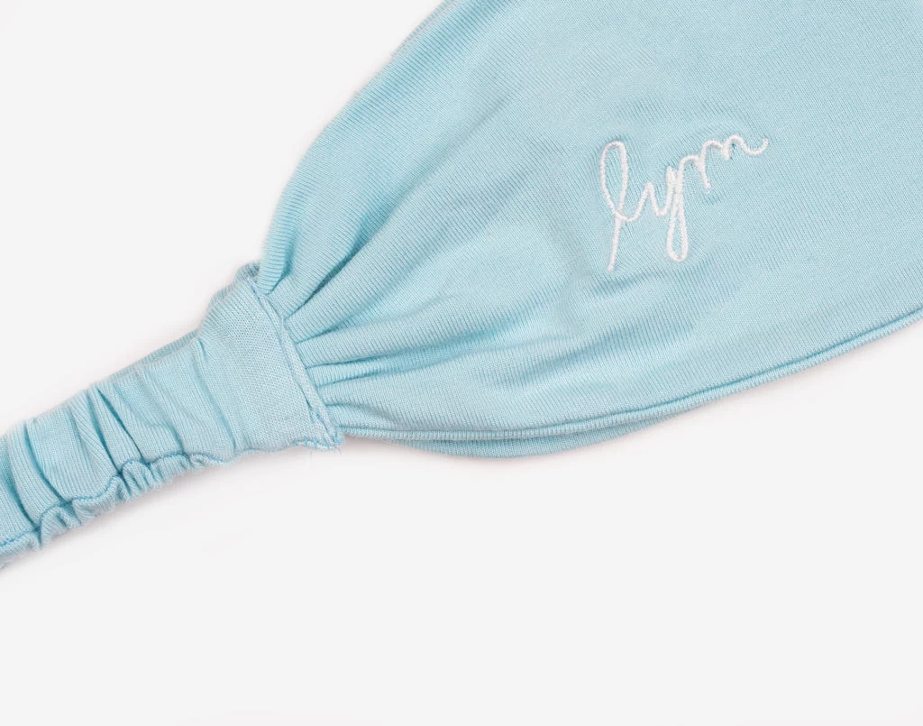 This light blue scrunch headband is perfect for a casual day or your hardest workout! This athletic style headband features a flat front with the Love Your Melon cursive logo embroidery in white and an encased elasticated back to fit most heads.