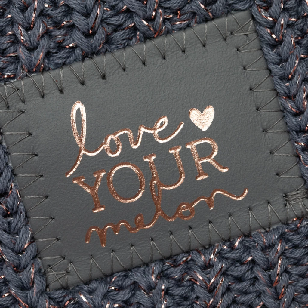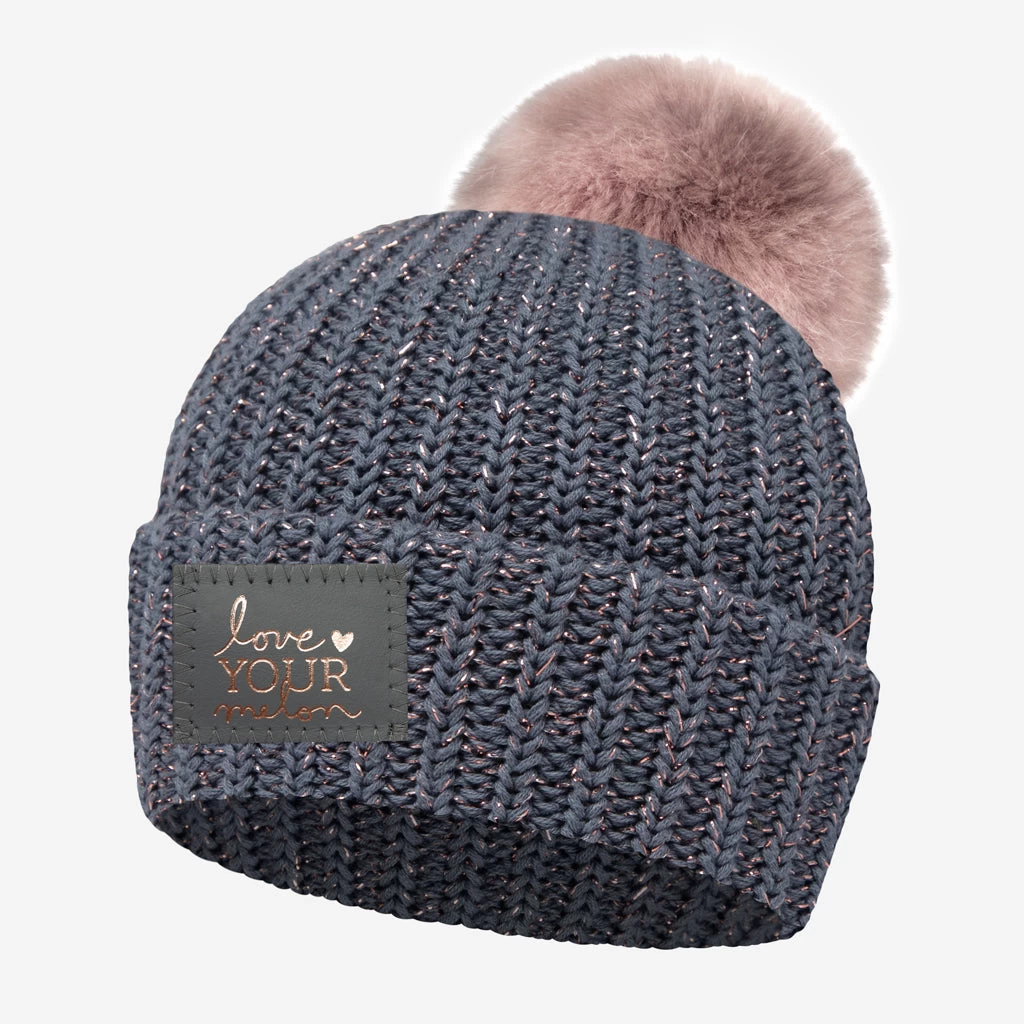 This light charcoal and rose gold metallic speckled pom beanie features a light charcoal leather patch, debossed with the Love Your Melon logo in rose gold foil and a blush detachable pom at the top. These beanies are incredibly cozy and warm.