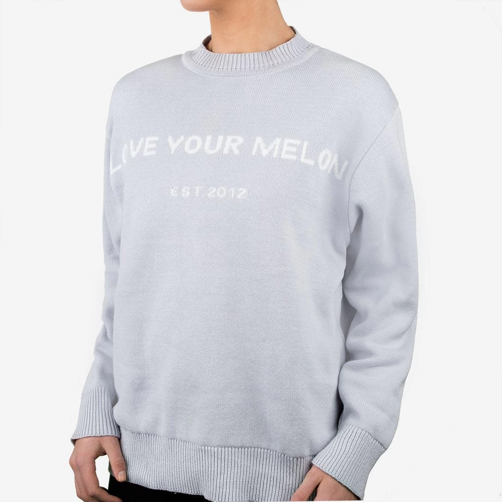 This classic logo sweater is made out of 100% Cotton Yarn in light gray yarn and features the Love Your Melon Est. 2012 Logo knit in white on the front. These sweaters feature a crewneck style, ribbed cuffs, and a loose oversized fit. Womens fit. See chart below for sizing.