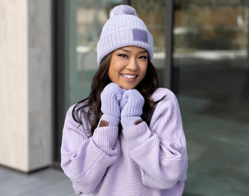 These Light Purple Mittens are made with our signature knit outer and lined with a soft polyester fleece. Each of the cuffs on the mitten are tacked in place for easy wear, and feature two red maple patches debossed with the Love Your Melon logo.