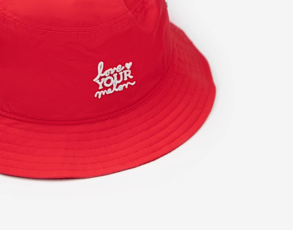 This nylon small red childrens bucket hat features the stacked Love Your Melon logo embroidered on the front in white. side metal rivet eyelets and a stitched brim. The fabric is lightweight, water-resistant and wicking, and durable with SPF 20+.