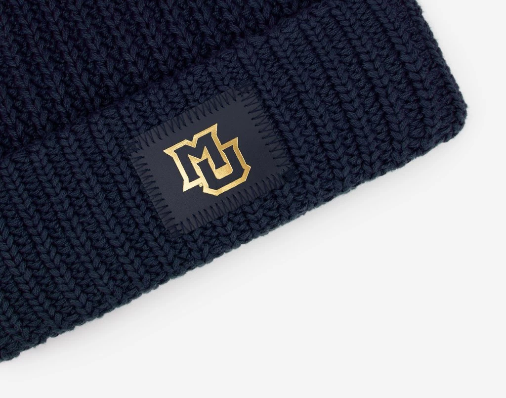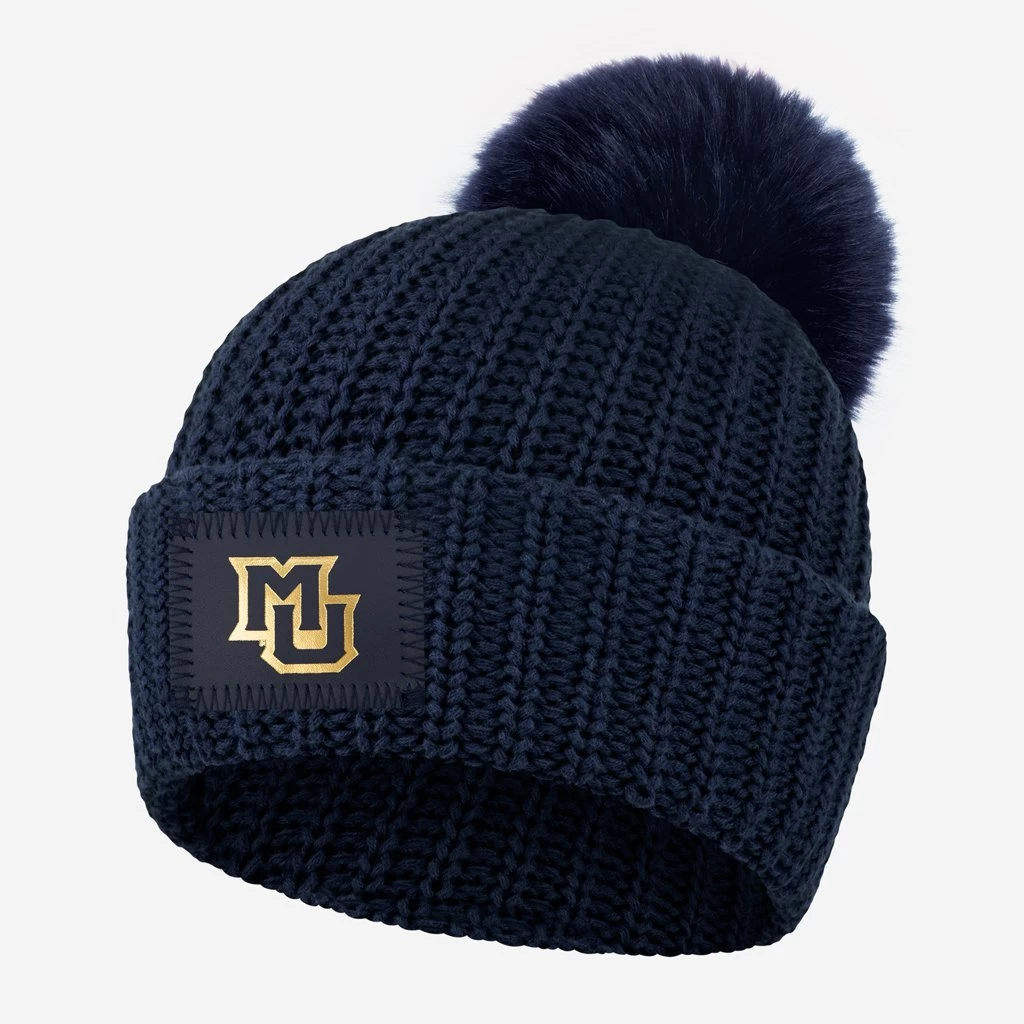 This navy pom beanie features a navy leather patch with the Marquette University logo debossed in gold foil on the front and a detachable navy faux fur pom. These pom beanies are incredibly cozy and fit more snug.