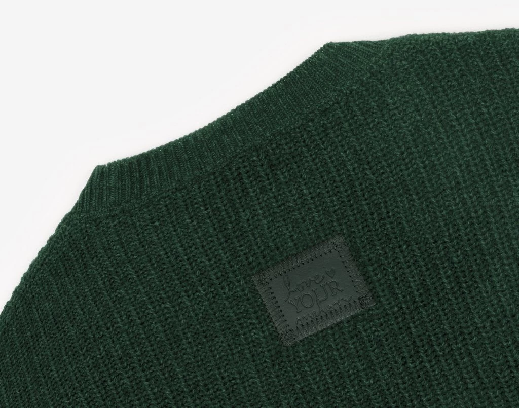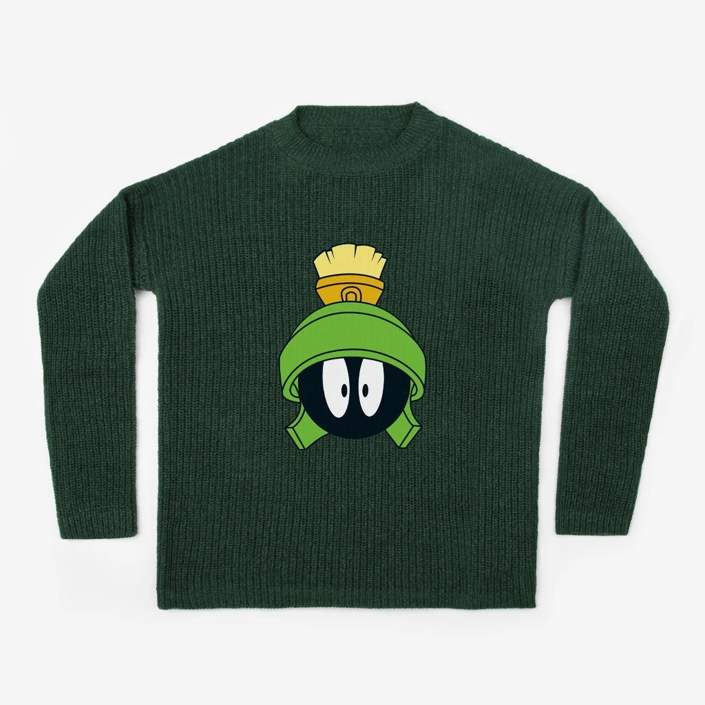 This knit crewneck sweater is knit in green yarn and features a crew neck style, drop shoulder sleeves, and a true to size fit with a branded genuine leather patch on the back neck. This sweater also features the Marvin the Martian icon printed onto the front.