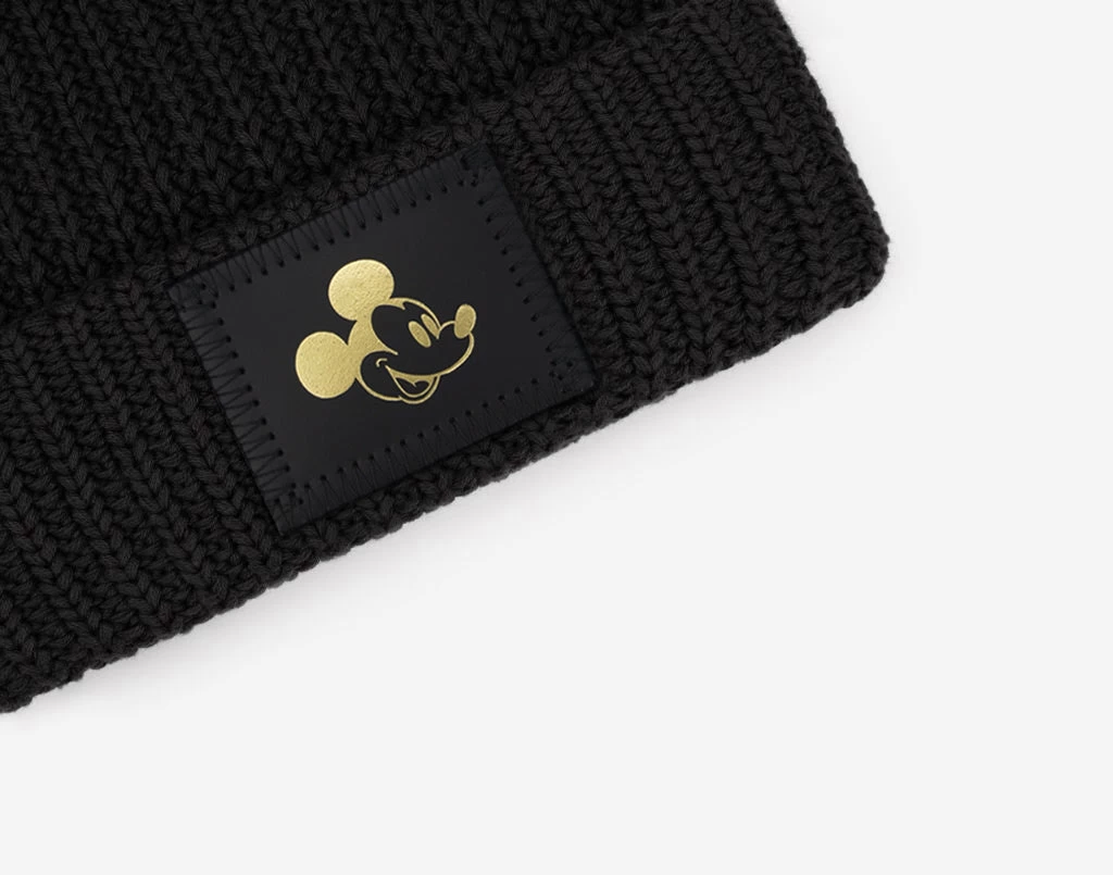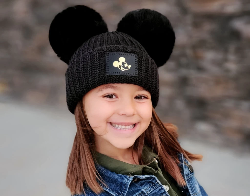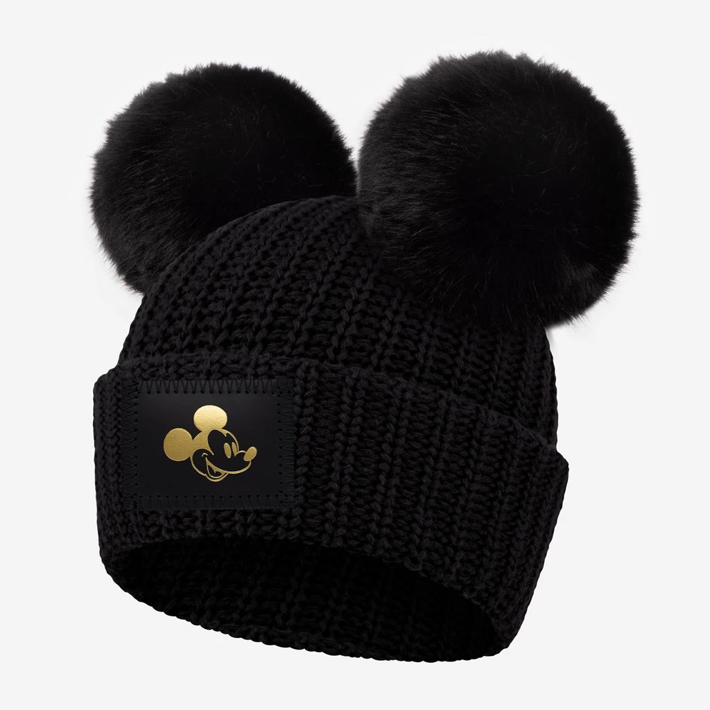 Your little one will be styling from ear to ear with this Mickey Mouse outline icon baby double pom beanie. This black speckled baby cuffed double pom beanie features a black genuine leather patch with the Mickey Mouse outline icon on the front in red foil and two detachable black faux fur pom ears. This beanie is incredibly cozy and the perfect essential for your newbie.