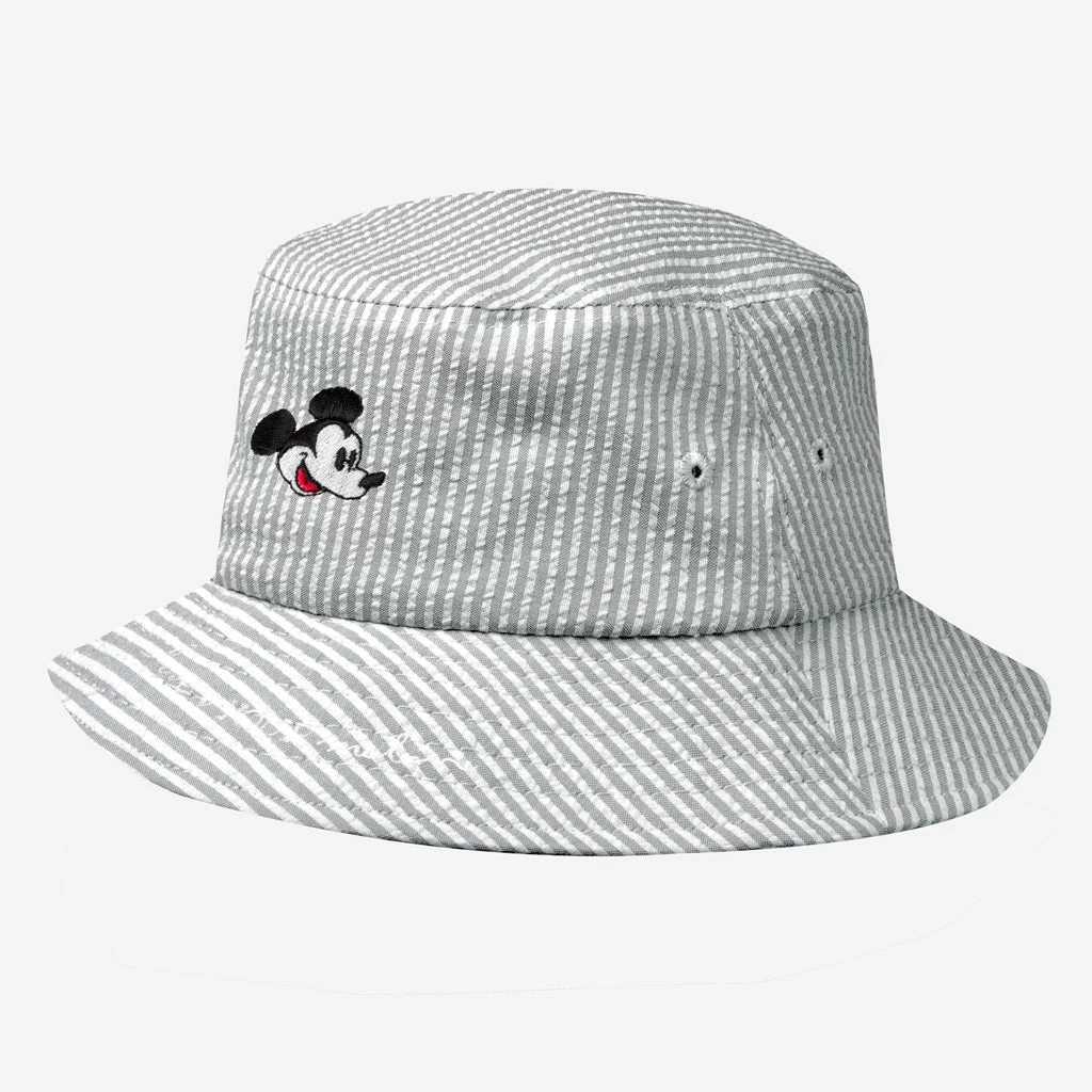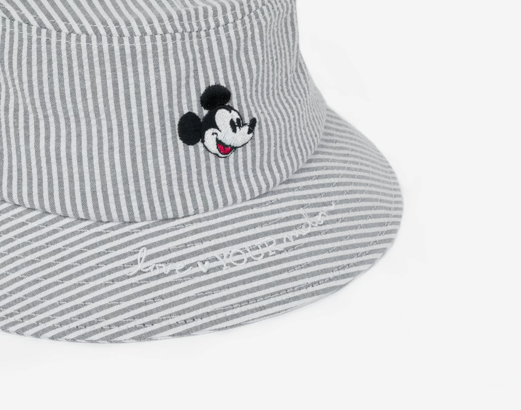 This Mickey Mouse black seersucker bucket hat will have you smiling from ear to ear! This cap is made from a stylish seersucker striped fabric that is lightweight, breathable, and soft with the Mickey Mouse face embroidered on the center front, and the Love Your Melon logo embroidered over the front brim. This bucket hat features a double stitched brim with embroidered eyelets for air flow.