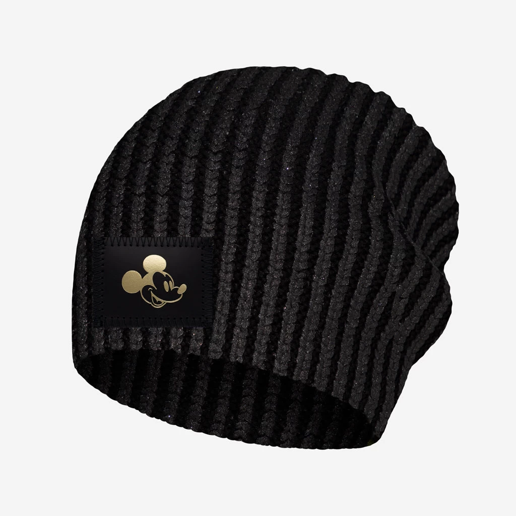 You are guaranteed to smile from ear to ear with this new Mickey Mouse beanie! This black knit beanie features a black metallic brushed finish with Mickey Mouse debossed in gold foil on a black leather patch at center front.