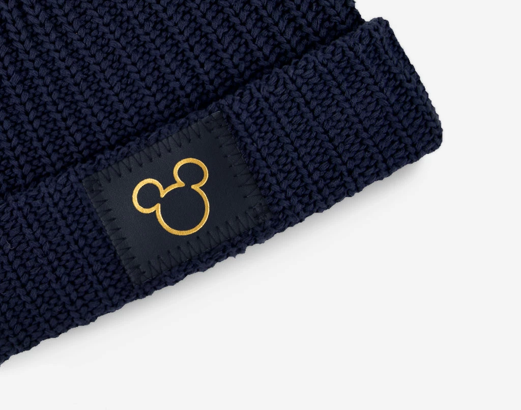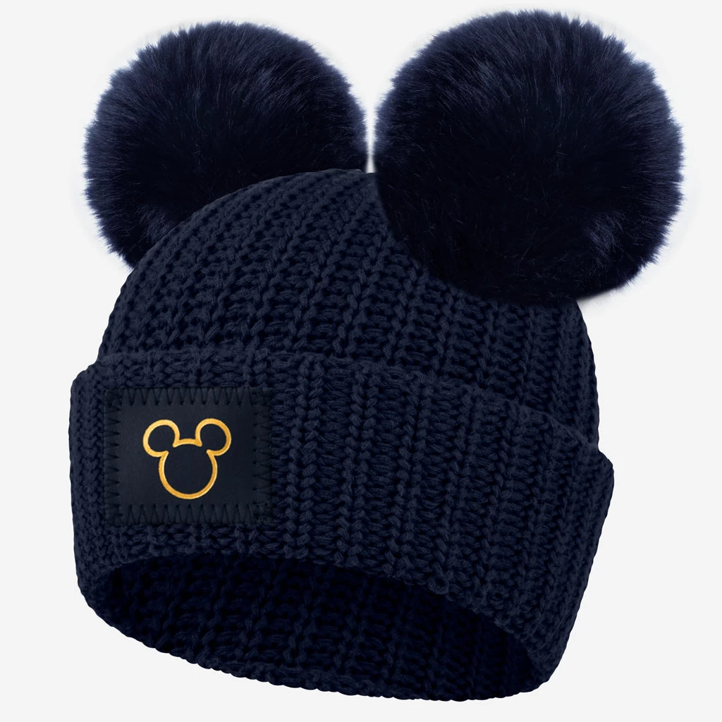 You will be styling from ear to ear when you top off your look with this Mickey Mouse outline icon double pom beanie. This navy cuffed double pom beanie features a navy genuine leather patch with the Mickey Mouse outline icon on the front in gold foil and two detachable navy faux fur pom ears.