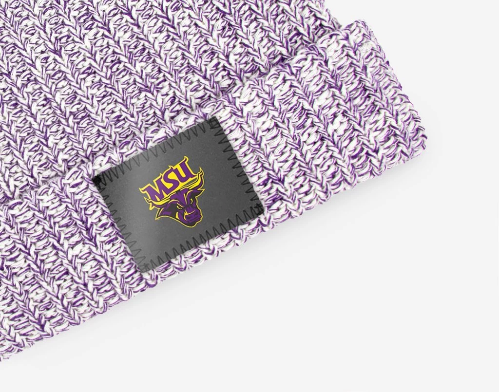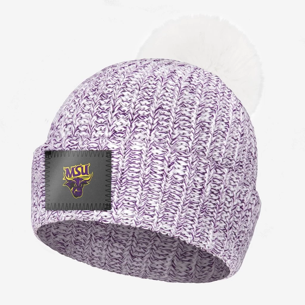 This white and purple speckled cuffed pom beanie features a charcoal reflective patch with the Mankato State University logo on the front and a detachable white faux fur pom. These beanies are very cozy and warm and fit more snug.