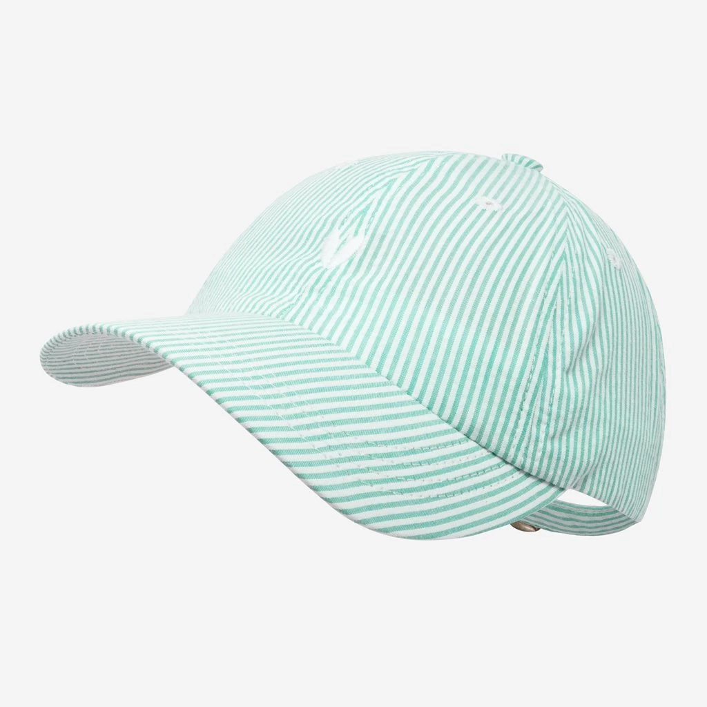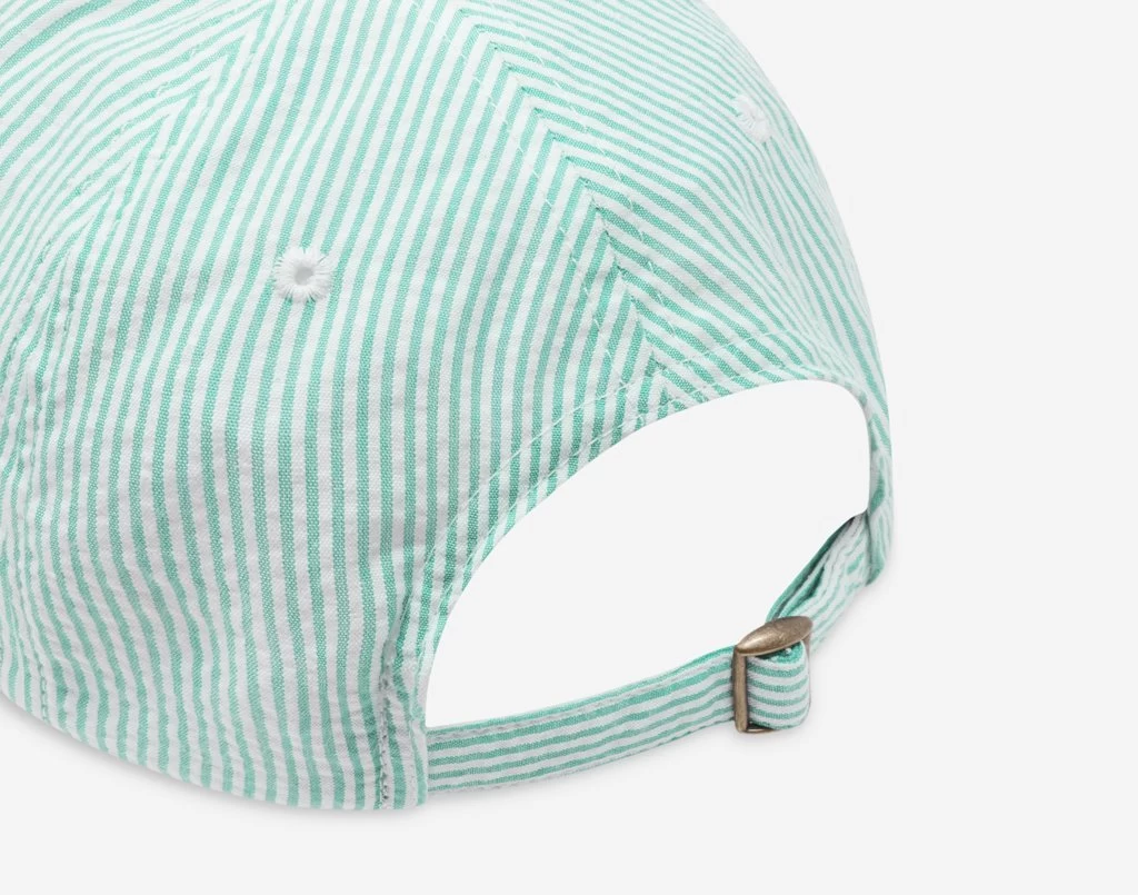 This mint seersucker cap features the Love Your Melon knit heart logo embroidered on the front in white and an adjustable strap at the back. This cap is unstructured.
